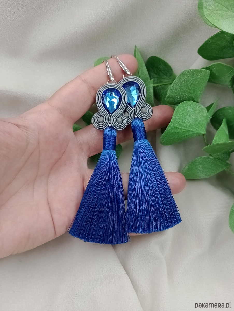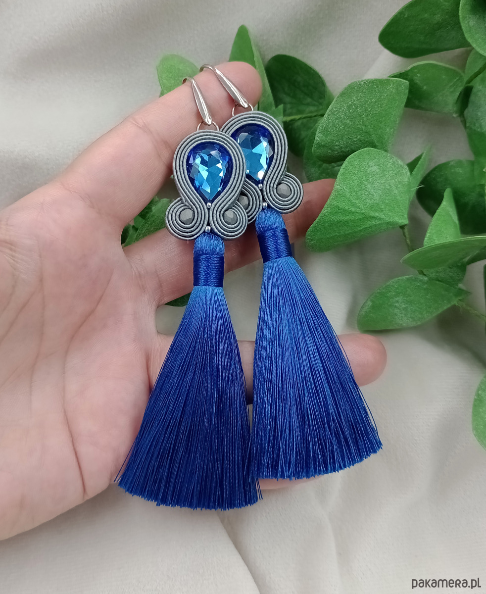 Kolczyki z chwostami kobaltowe, niebieskie szare chwosty, długie klipsy