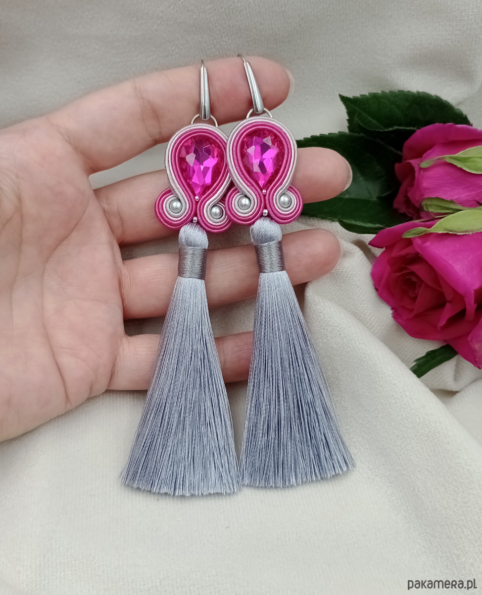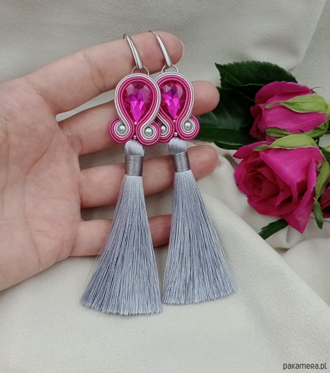 Kolczyki z chwostami w połączeniu różu (mocnego, fuksjowego) z srebrzystą szarością.