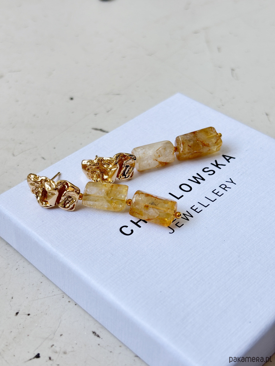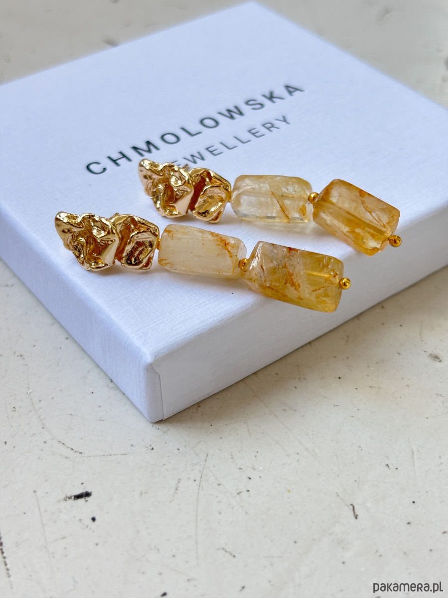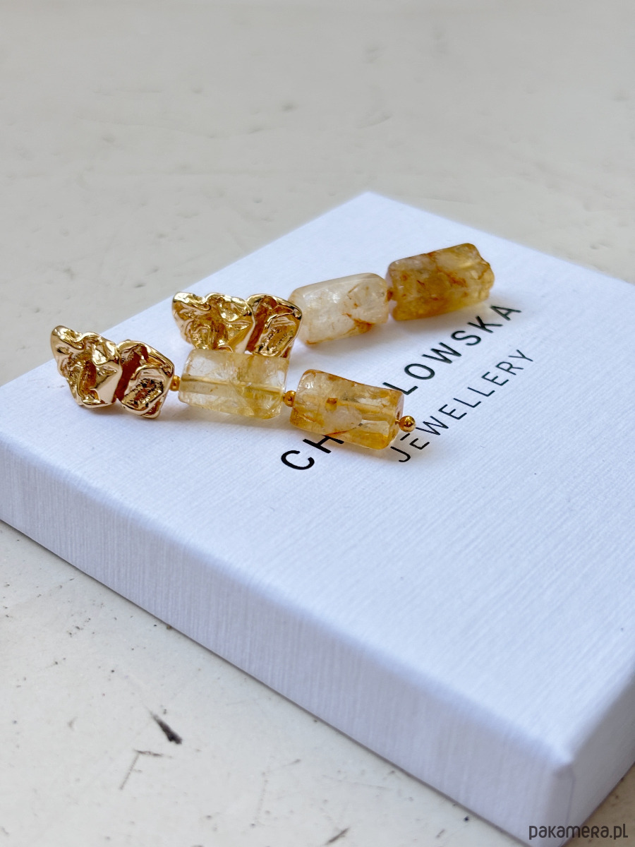 Kolczyki są wykonane ze sztyftu z mosiądzu pozłacanego i cytrynu.