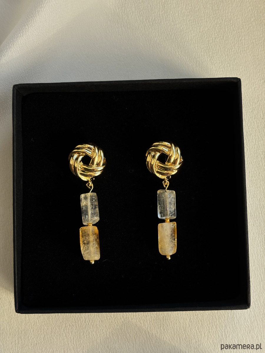 Kolczyki są wykonane ze sztyftu z mosiądzu pozłacanego i cytrynu.