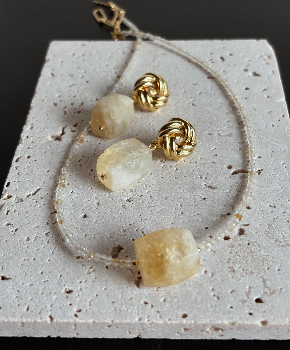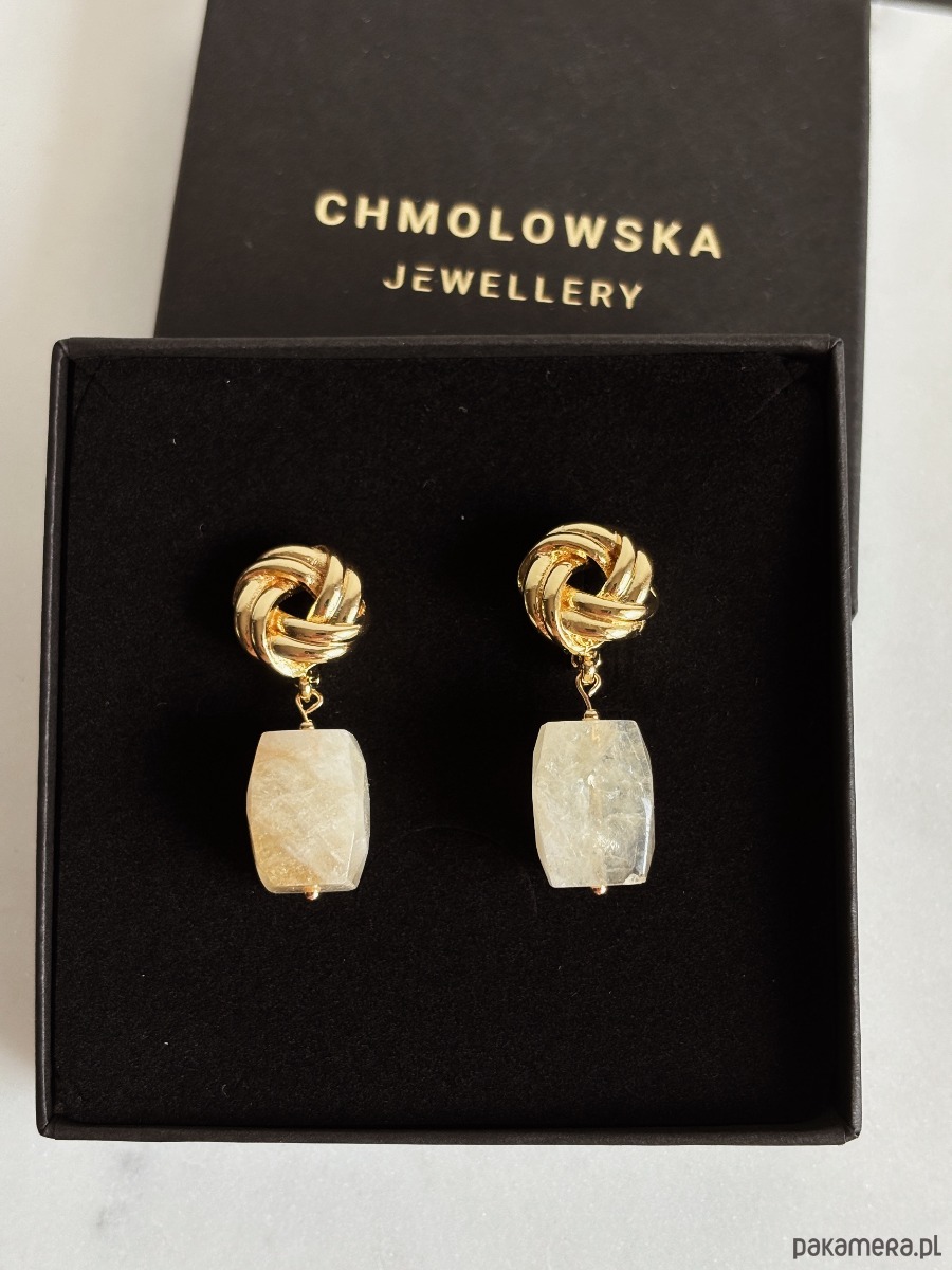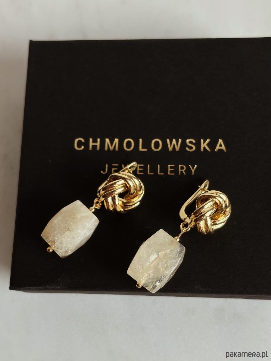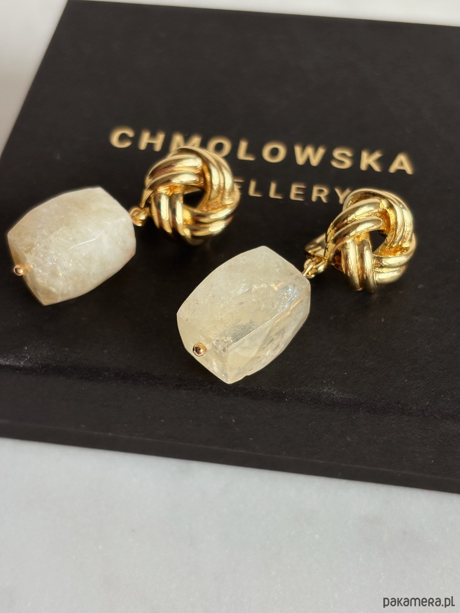 Kolczyki wykonane z ozdobnych, złotych elementów o splocie w formie węzła, uzupełnione naturalnym kamieniem w jasnym, surowym wykończeniu. Połączenie wyrazistej formy z delikatnością kamienia nadaje im elegancki, ale nienachalny charakter. Lekka konstrukcja sprawia, że są wygodne w noszeniu na co dzień i na specjalne okazje. Element metalowy wykonany jest z mosiądzu i rodowany złotem.