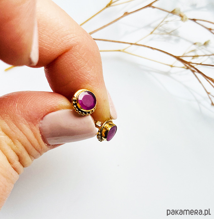 Delikatne złocone eleganckie kolczyki sztyfty z filigranowym motywem i czerwonym rubinem. Kolczyki są idealnej wielkości.