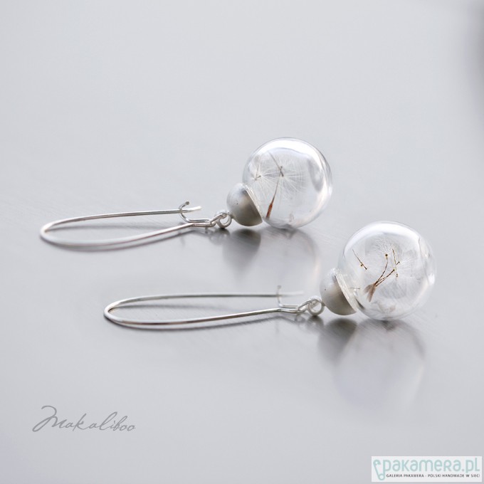Niezwykle, delikatne, eleganckie, kobiece kolczyki z nasionami dmuchawca zamkniętymi swobodnie w szklanej kuli. Każdy egzemplarz jest niepowtarzalny. Nasionka zostały specjalnie spreparowane i nie zmienią swojego wyglądu podczas noszenia. Szklana kula ma średnicę 16 mm. Długość kolczyka ok. 5,5 cm Baza w kolorze srebrnym.