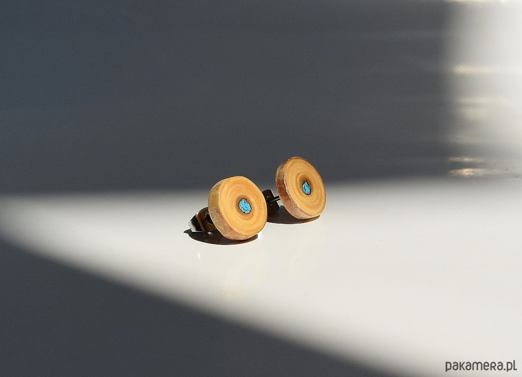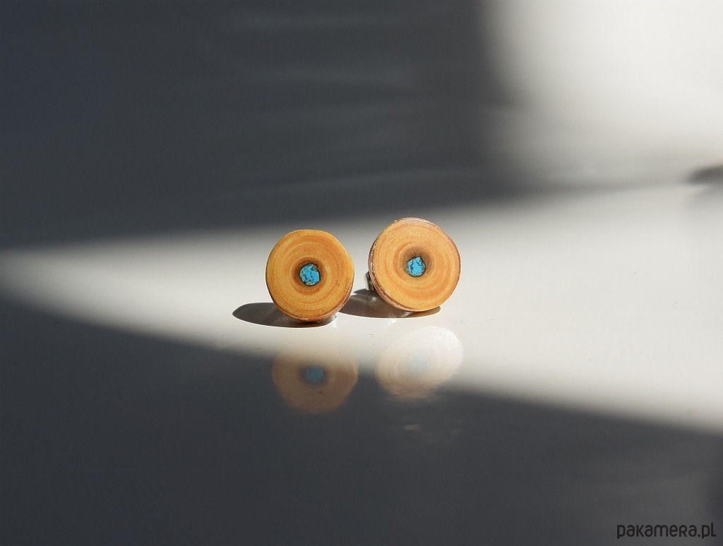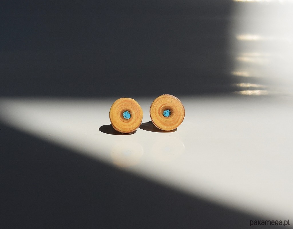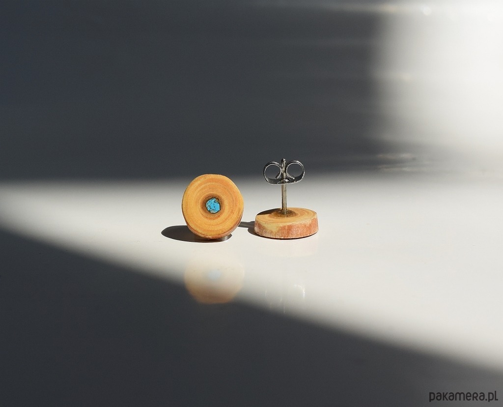 Kolczyki wykonane zostały z drewna cisu oraz inkrustacji z turkusu. Piękne, naturalne przebarwienia stworzone przez naturę oraz dodanie minerału sprawiły, że są wyjątkowe. Drewno zabezpieczone naturalnymi woskami i wypolerowane. Sztyfty wpuszczone i wklejone w drewno (nie są przyklejone na drewnie) dla trwałego połączenia obu elementów. Tak sztyfty jak i baranki są ze stali chirurgicznej, więc nie powodują uczulenia i nie ciemnieją podczas noszenia.