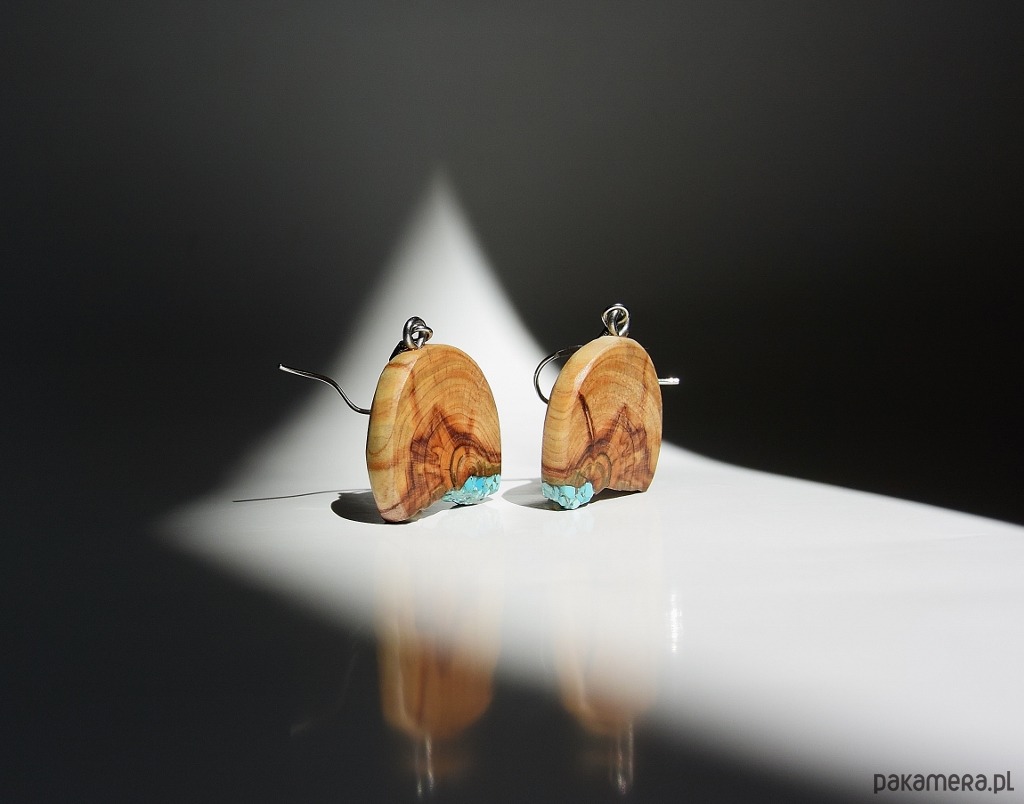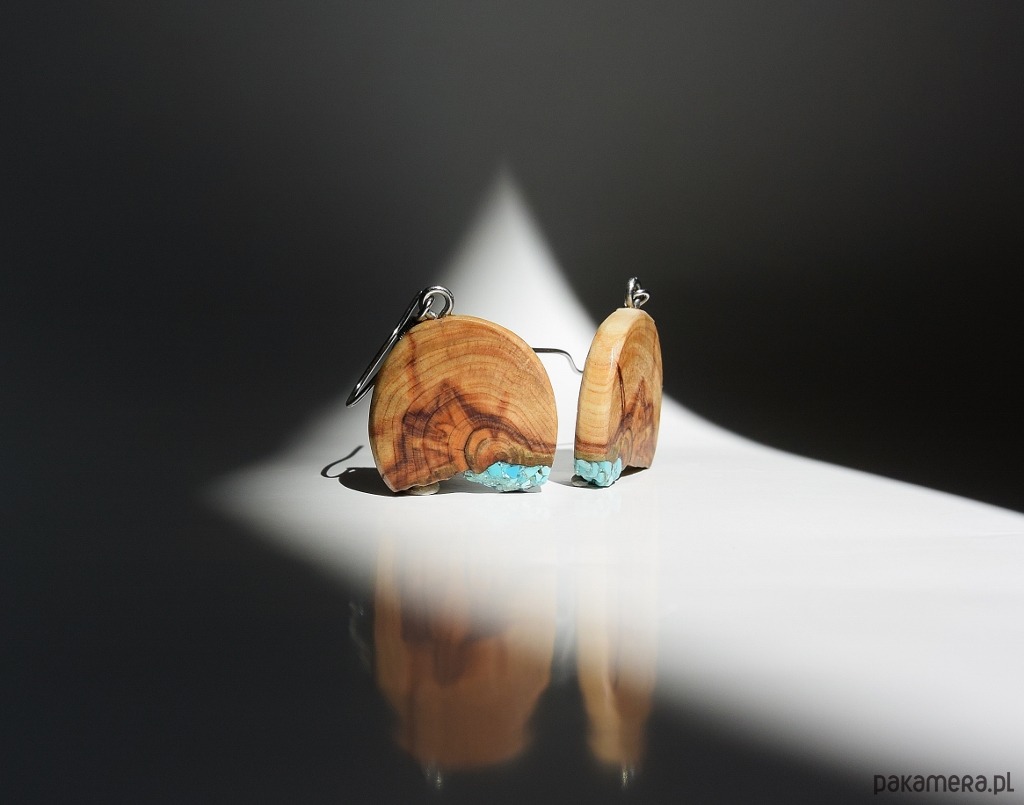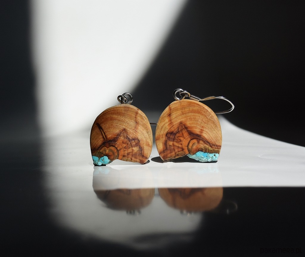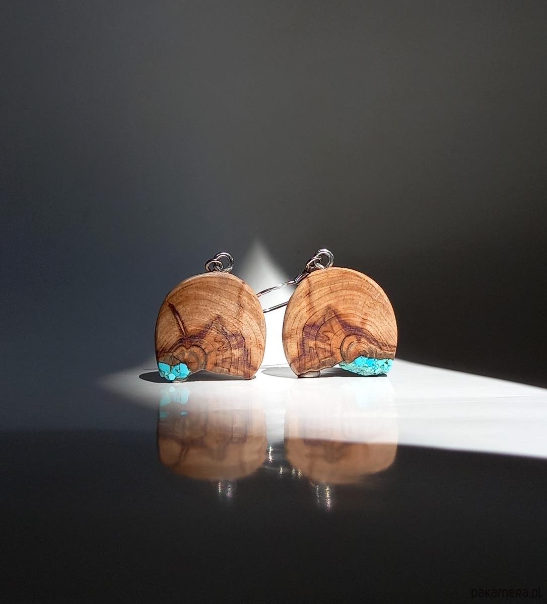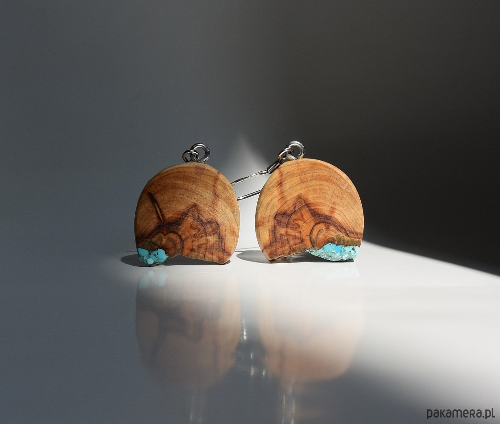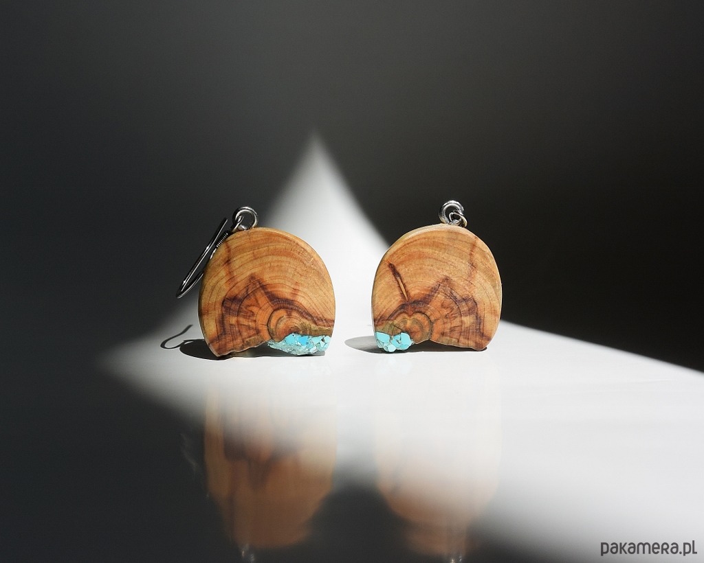 Kolczyki zrobione zostały z drewna lilaka (popularnie nazywane bzem) oraz inkrustacji z naturalnego, pokruszonego turkusu. Piękny rysunek namalowany przez naturę, który mnie skojarzył się z górami oraz dodanie minerału sprawiły, że są wyjątkowe. Przypatrz się, bo może Ty zobaczysz na tych plasterkach zupełnie co innego i z czym innym Ci się skojarzy, przecież ogranicza nas tylko wyobraźnia :)