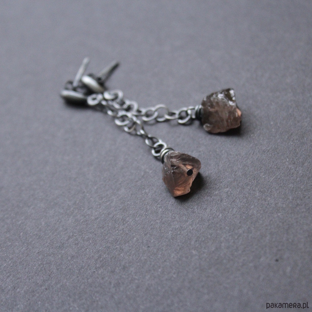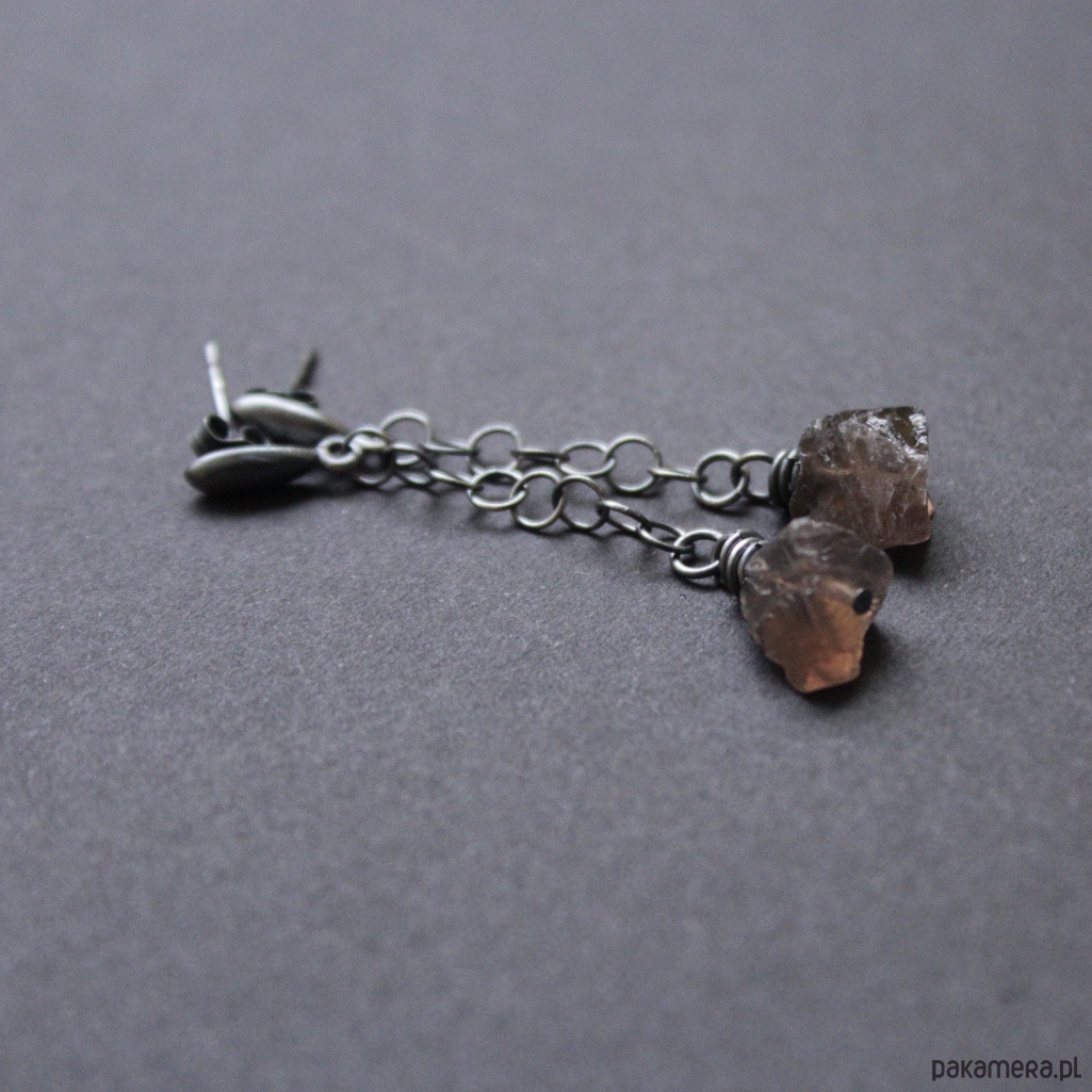 Oryginalne kolczyki wykonane zostały zoksydowanego srebra próby 925 oraz bryłek surowego kwarcu dymnego wielkości 0,8 cm.