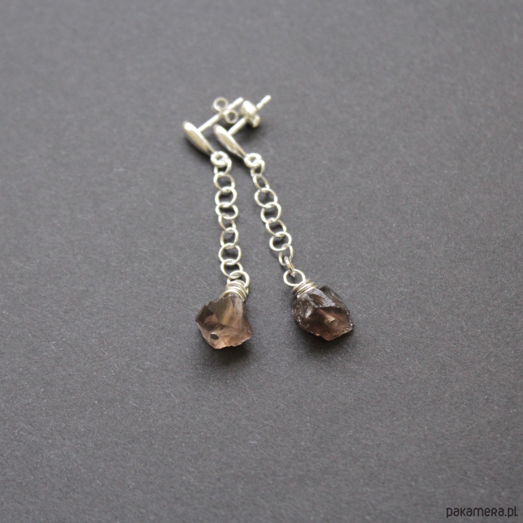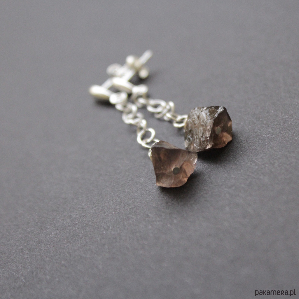 Kolczyki wykonane zostały ze srebra próby 925 oraz bryłek surowego kwarcu dymnego wielkości 0,65 cm.