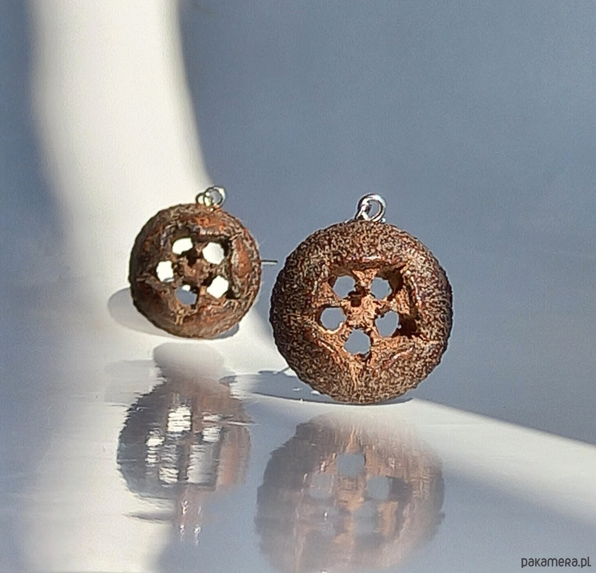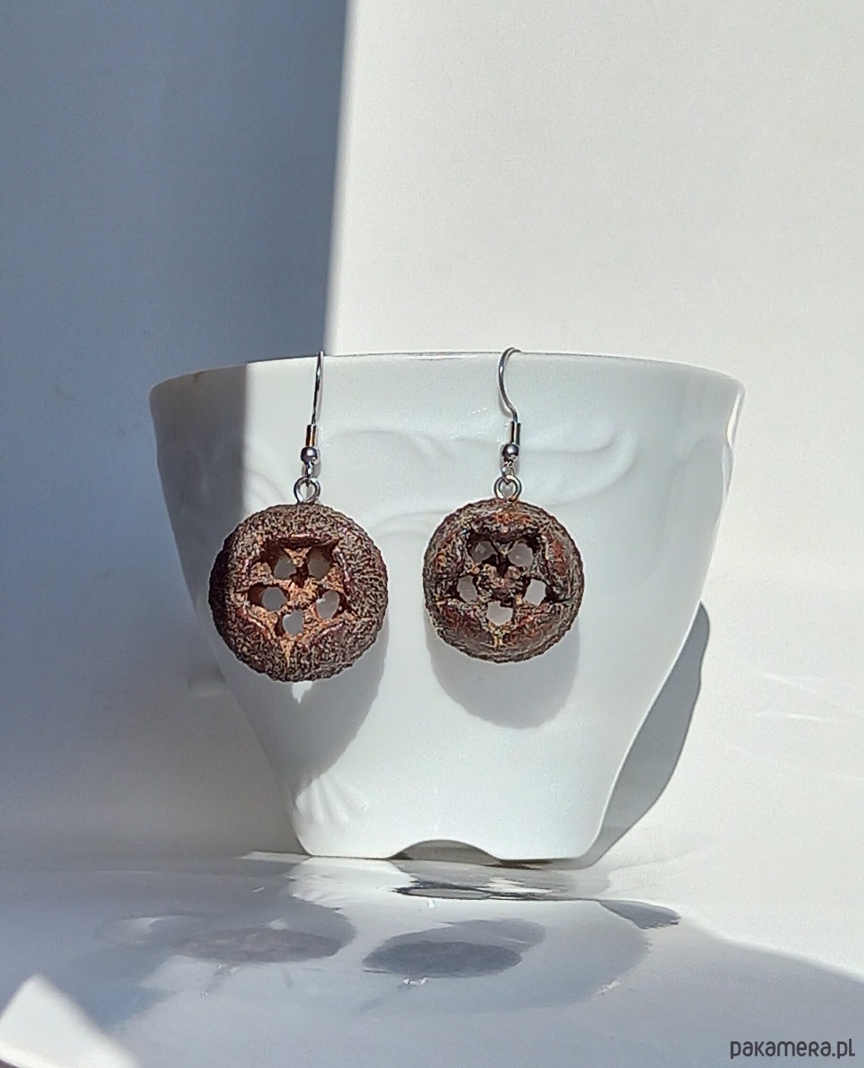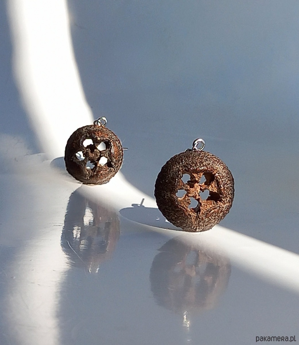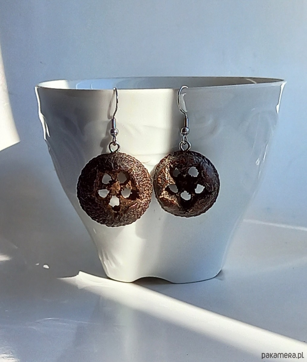 Kolczyki zrobione zostały ze strąków nasiennych eukaliptusa. Zabezpieczone naturalnymi woskami i wypolerowane.
