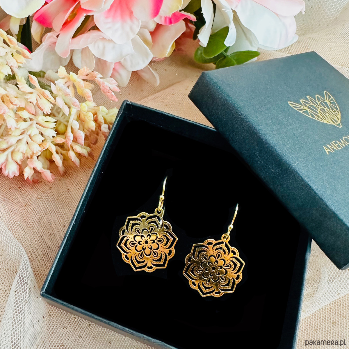 Kolczyki z filigranowymi rozetami, złote wiszące kolczyki