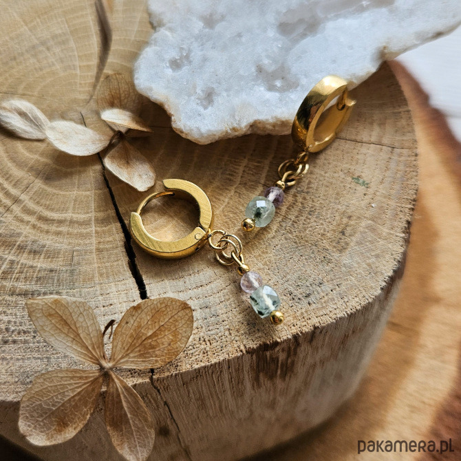 Kolczyki, które łączą w sobie zarówno baśniowy klimat, jak i nowoczesną formę. Fluoryt i frenit w delikatnych, romantycznych odcieniach liliowego i zieleni, zawieszone zostały na biglach - kajdankach ze stali szlachetnej, które nadają całości nowoczesny styl. Całość uzupełniona została delikatnymi dodatkami ze stali szlachetnej w kolorze złotym.