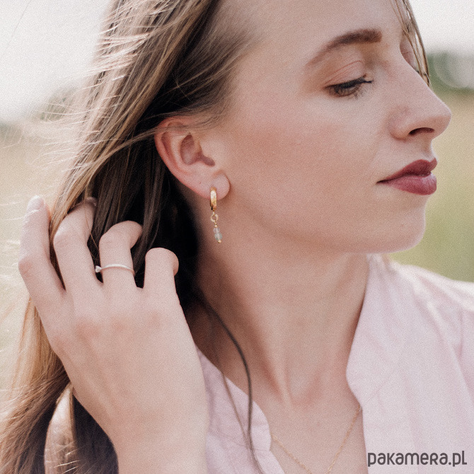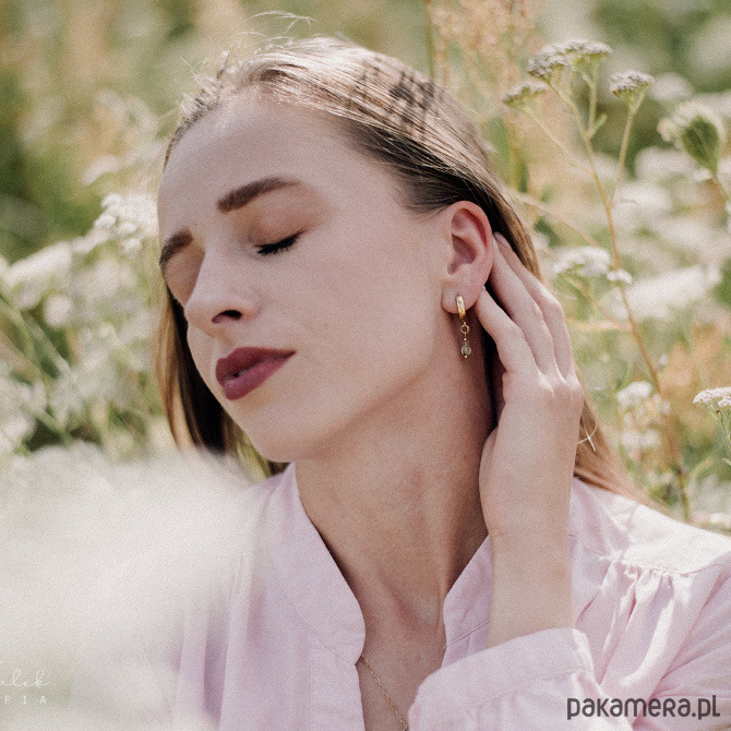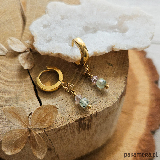 Kolczyki, które łączą w sobie zarówno baśniowy klimat, jak i nowoczesną formę. Fluoryt i frenit w delikatnych, romantycznych odcieniach liliowego i zieleni, zawieszone zostały na biglach - kajdankach ze stali szlachetnej, które nadają całości nowoczesny styl. Całość uzupełniona została delikatnymi dodatkami ze stali szlachetnej w kolorze złotym.