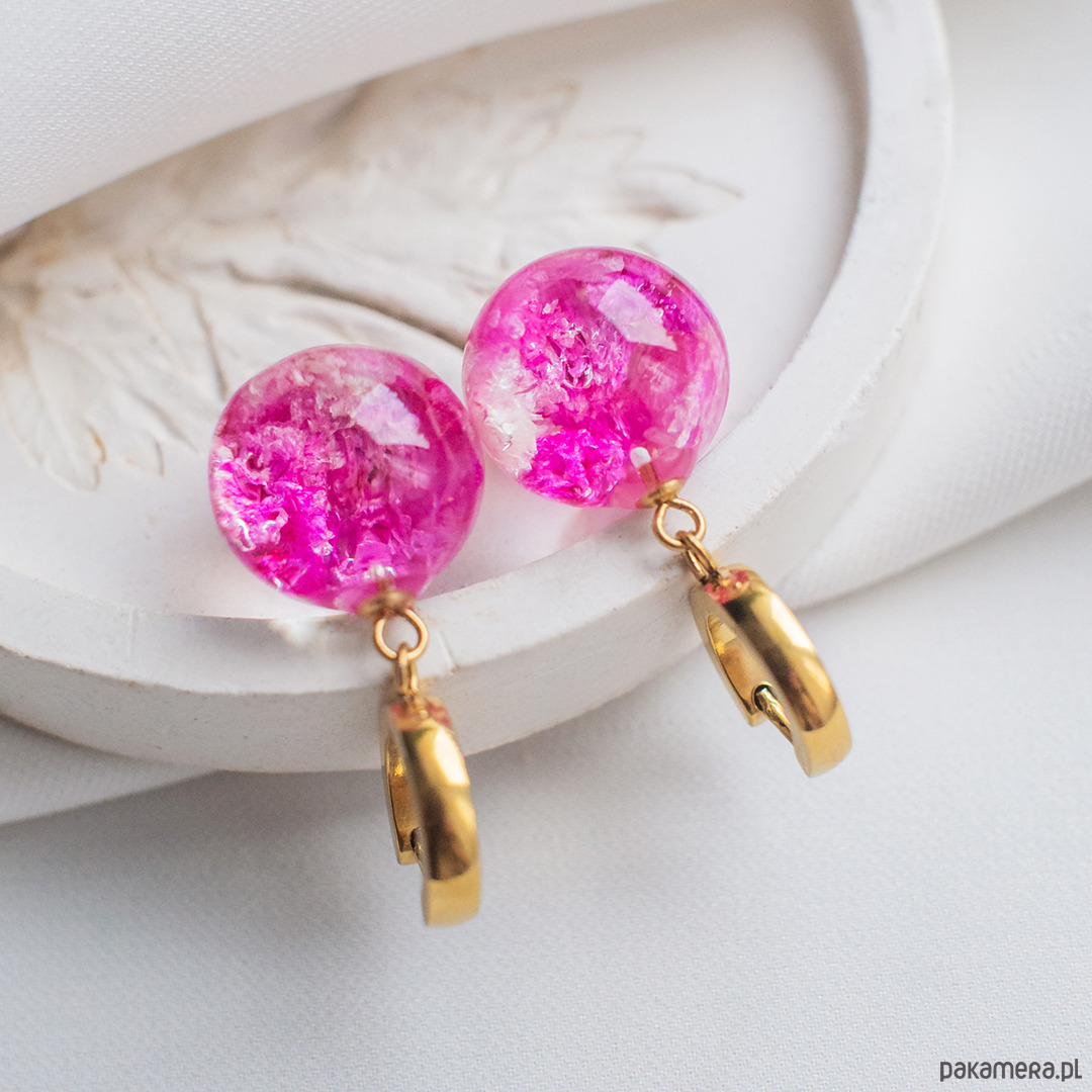 Kolczyki wykonany jest z żywicy epoksydowej z wykorzystaniem suszonych kwiatów. Metalowe elementy to stal nierdzewna szlachetna chirurgiczna.