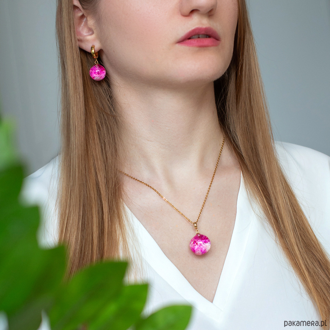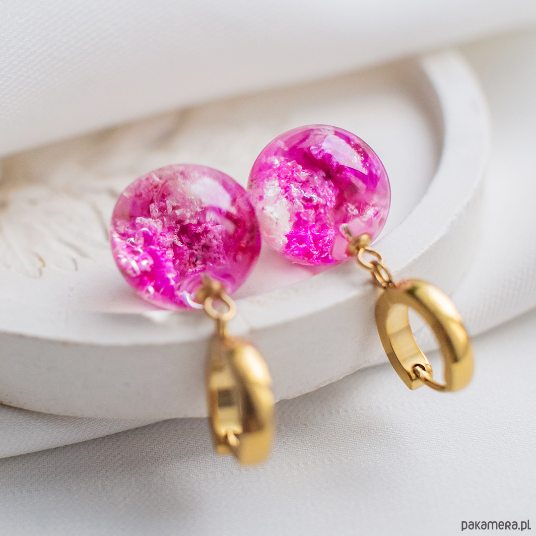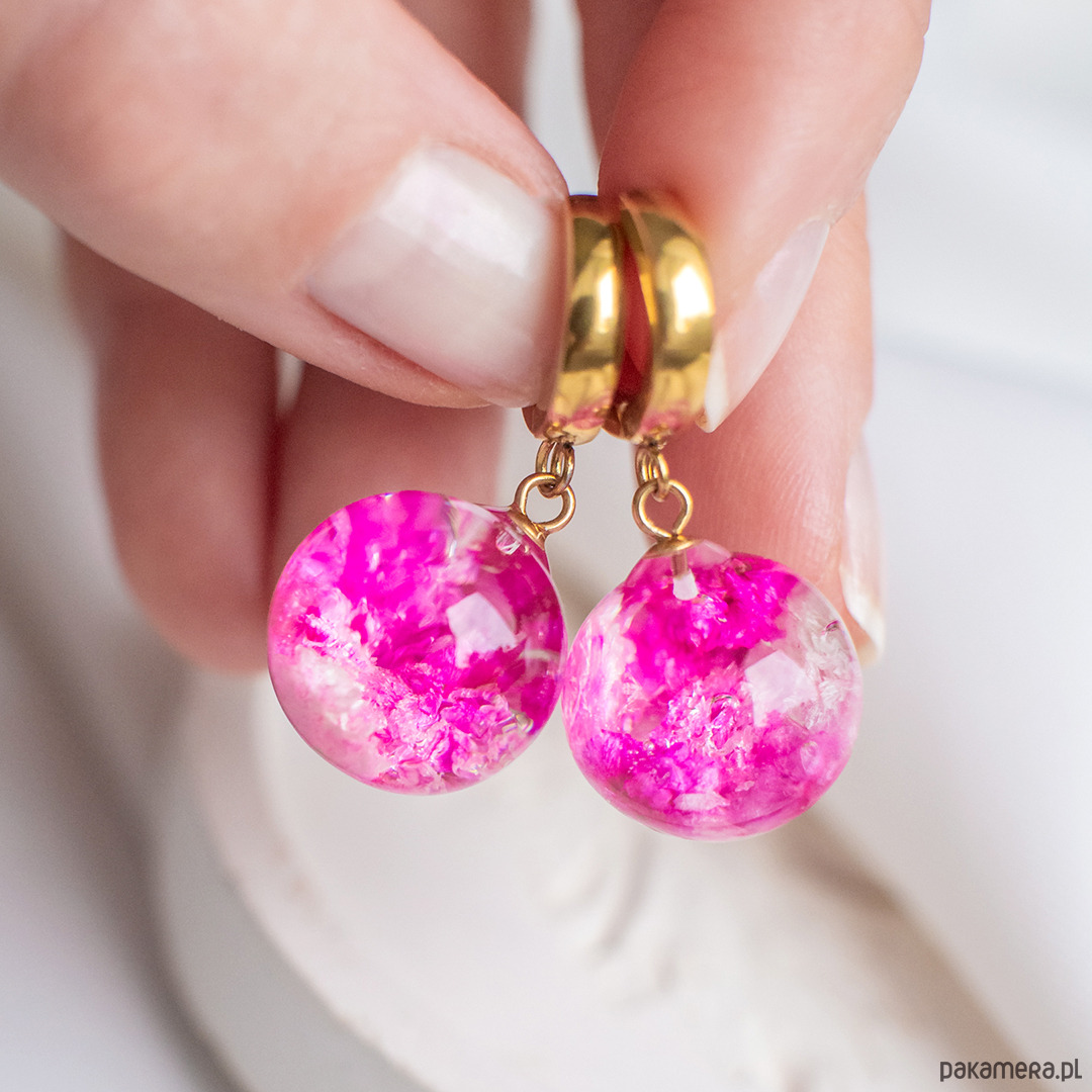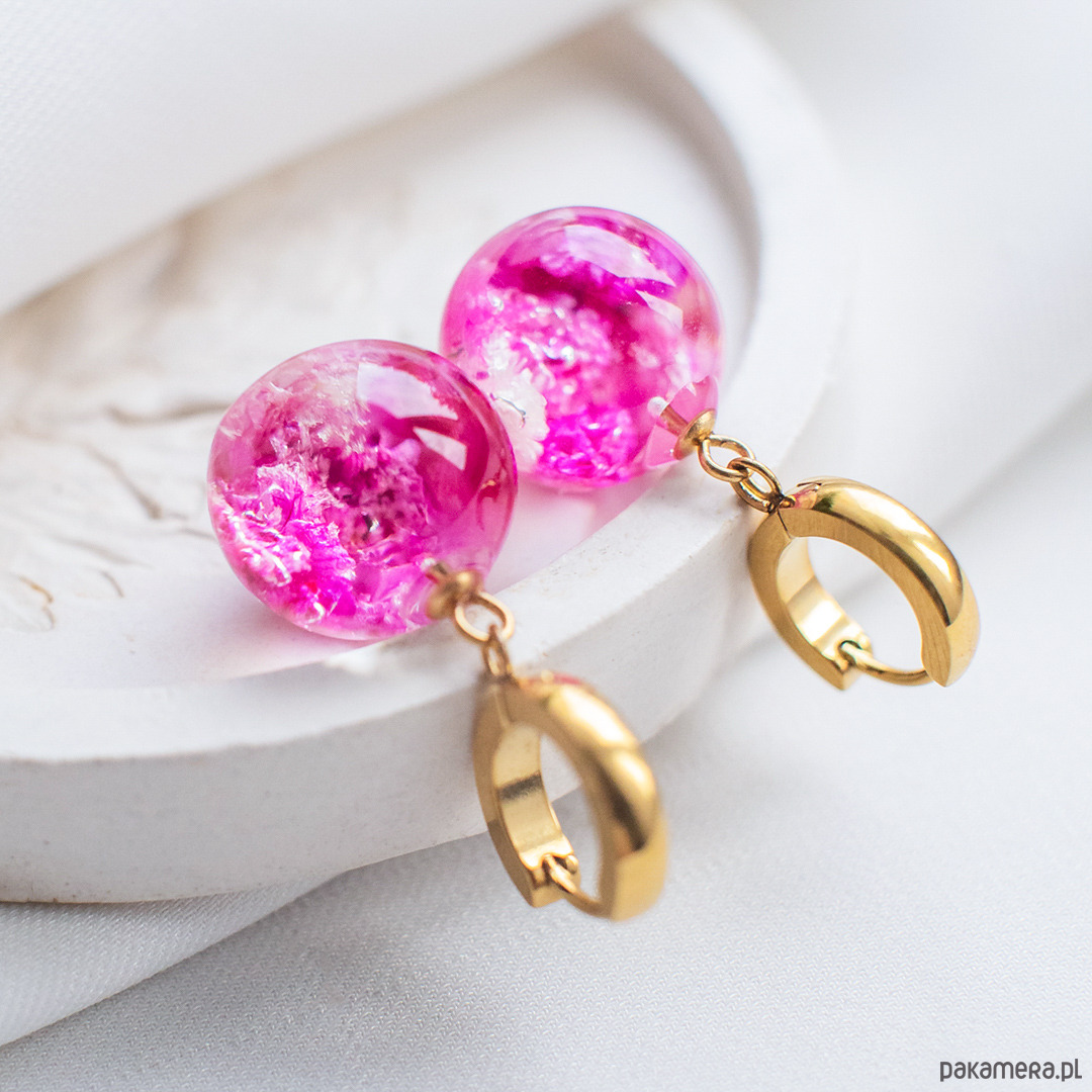 Kolczyki wykonany jest z żywicy epoksydowej z wykorzystaniem suszonych kwiatów. Metalowe elementy to stal nierdzewna szlachetna chirurgiczna.