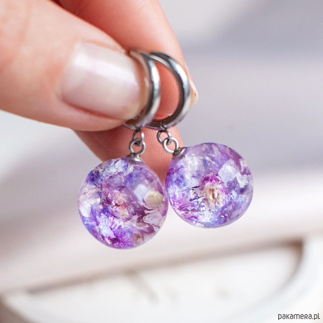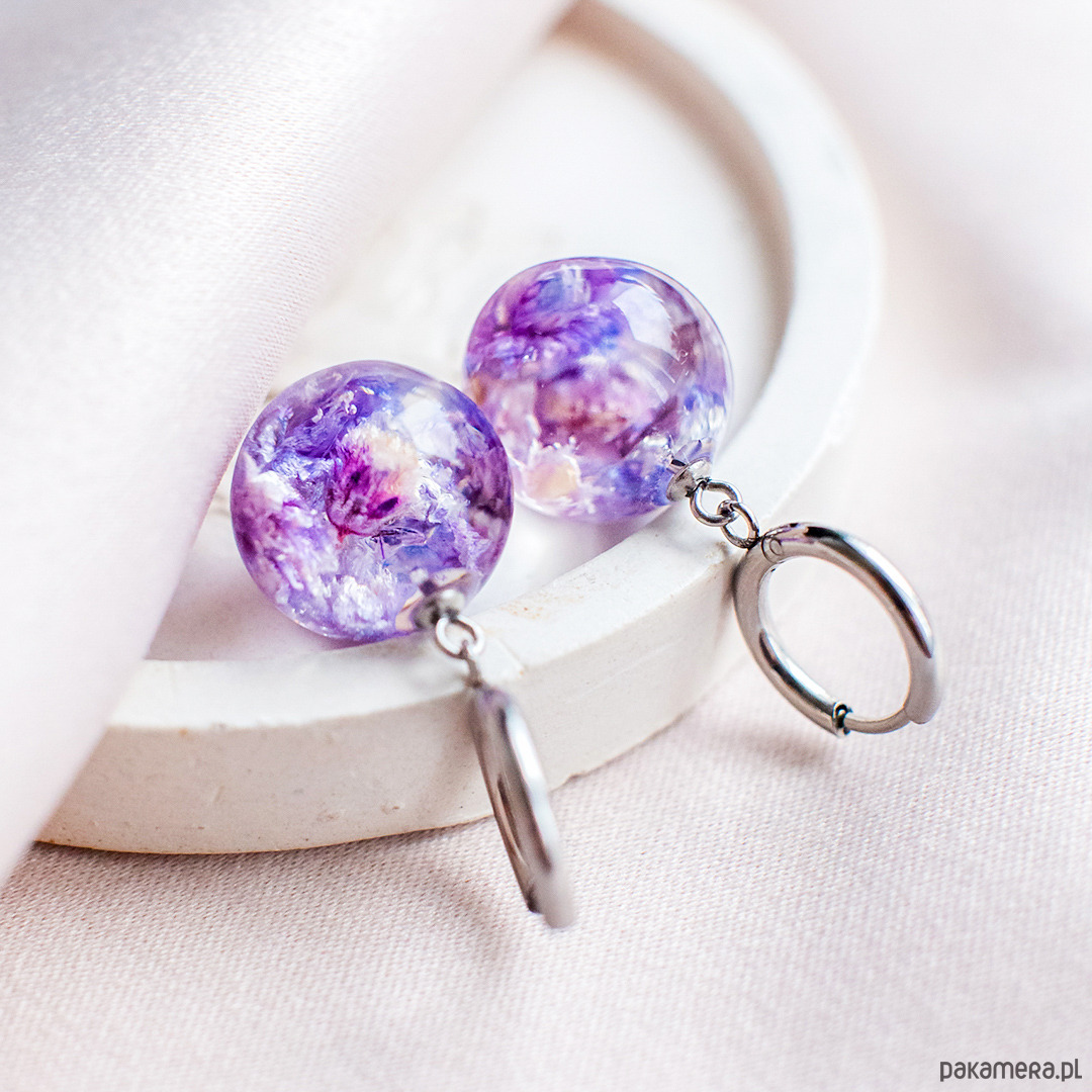 Kolczyki wykonany jest z żywicy epoksydowej z wykorzystaniem suszonych kwiatów. Metalowe elementy to stal nierdzewna szlachetna chirurgiczna.