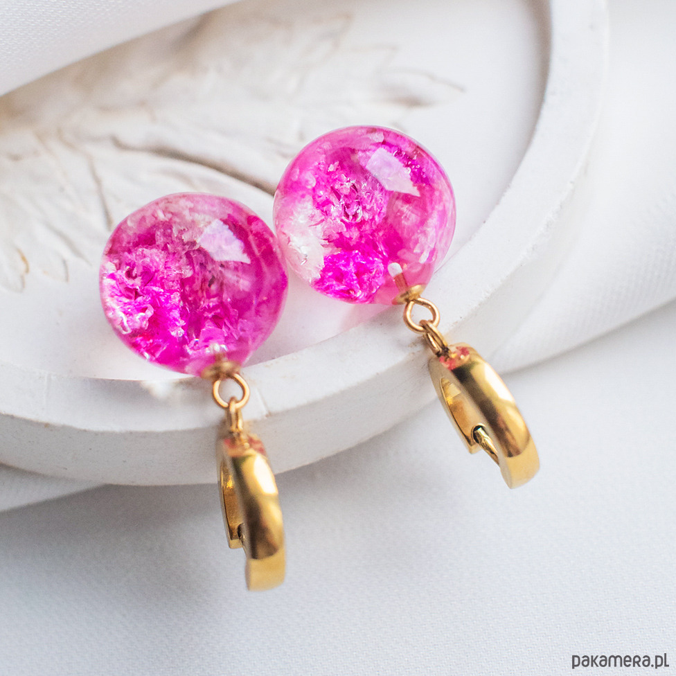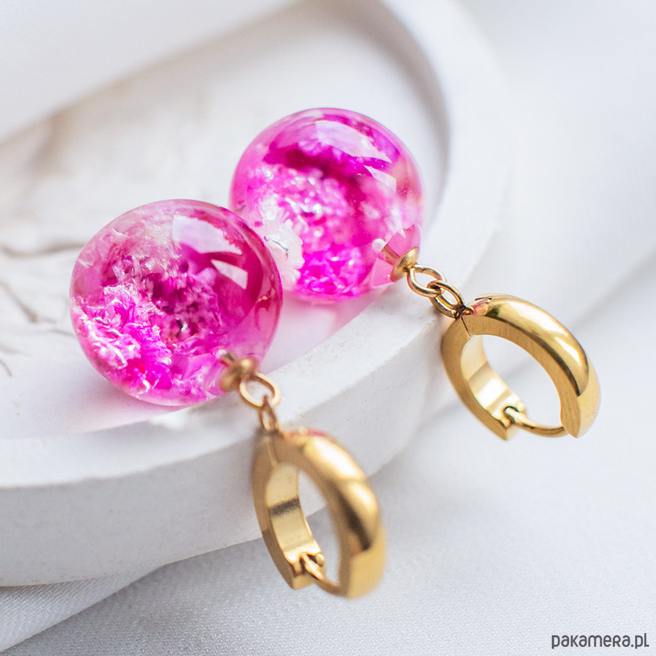 Kolczyki wykonany jest z żywicy epoksydowej z wykorzystaniem suszonych kwiatów. Metalowe elementy to stal nierdzewna szlachetna chirurgiczna.