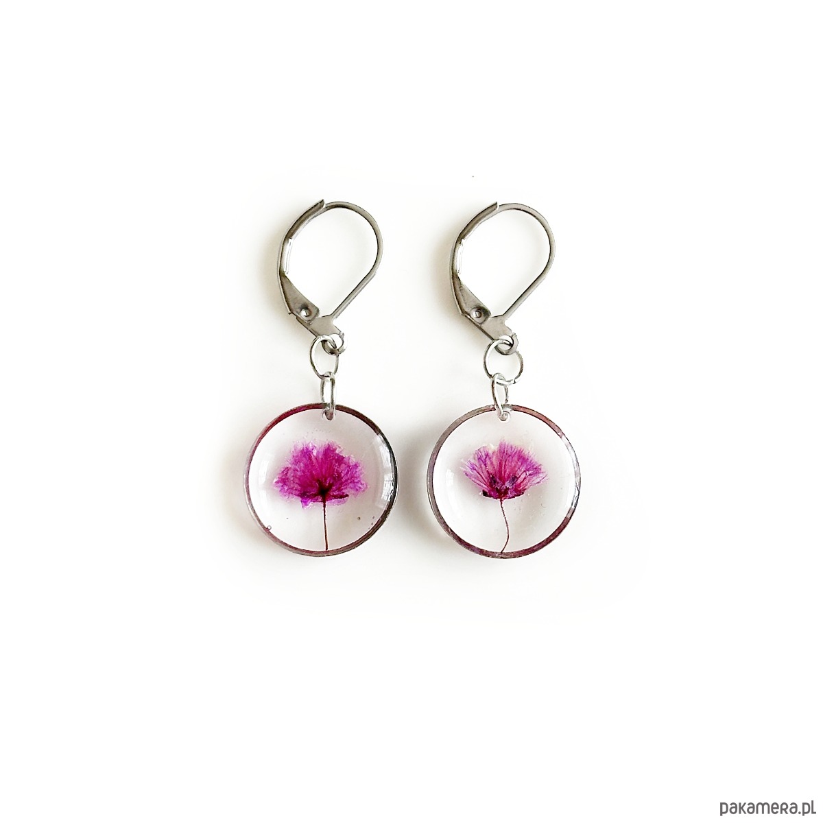 Kolczyki wiszące wykonane ze stali szlachetnej oraz żywicy epoksydowej.