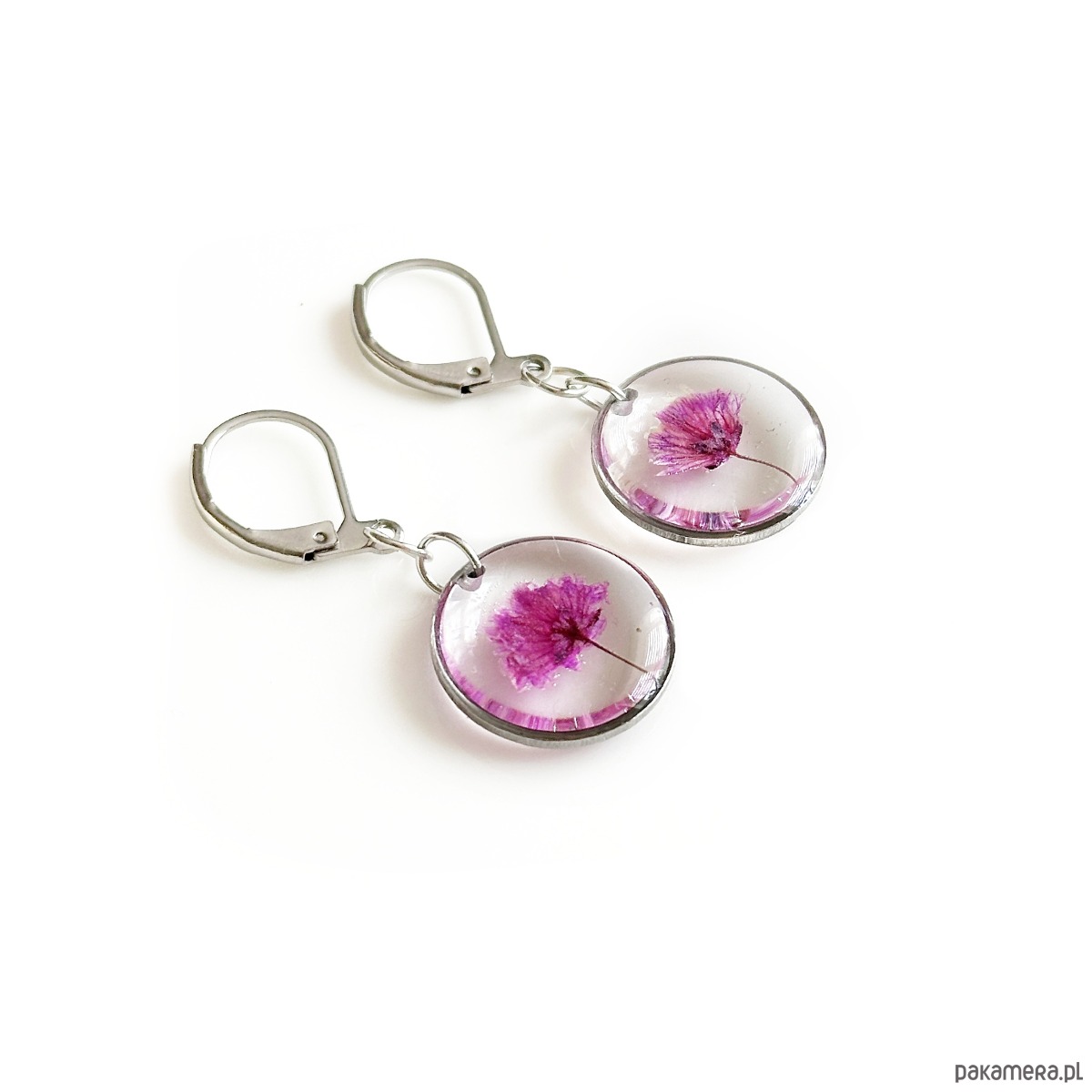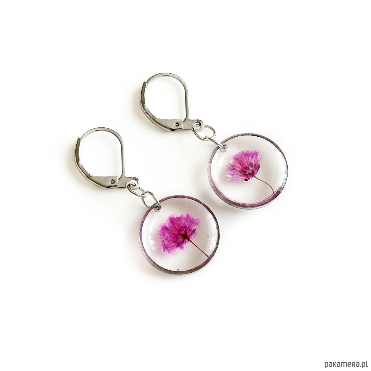 Kolczyki wiszące wykonane ze stali szlachetnej oraz żywicy epoksydowej.