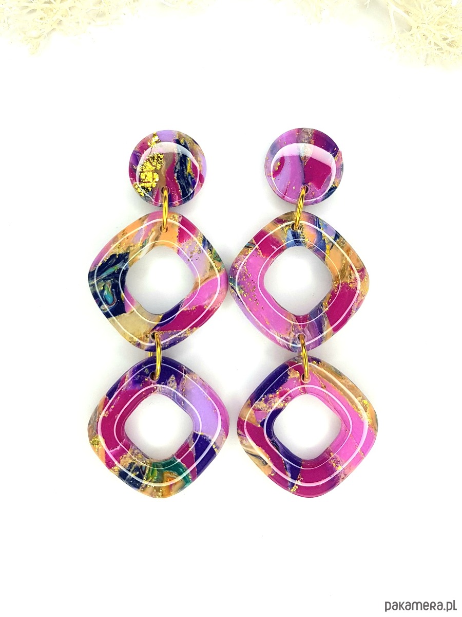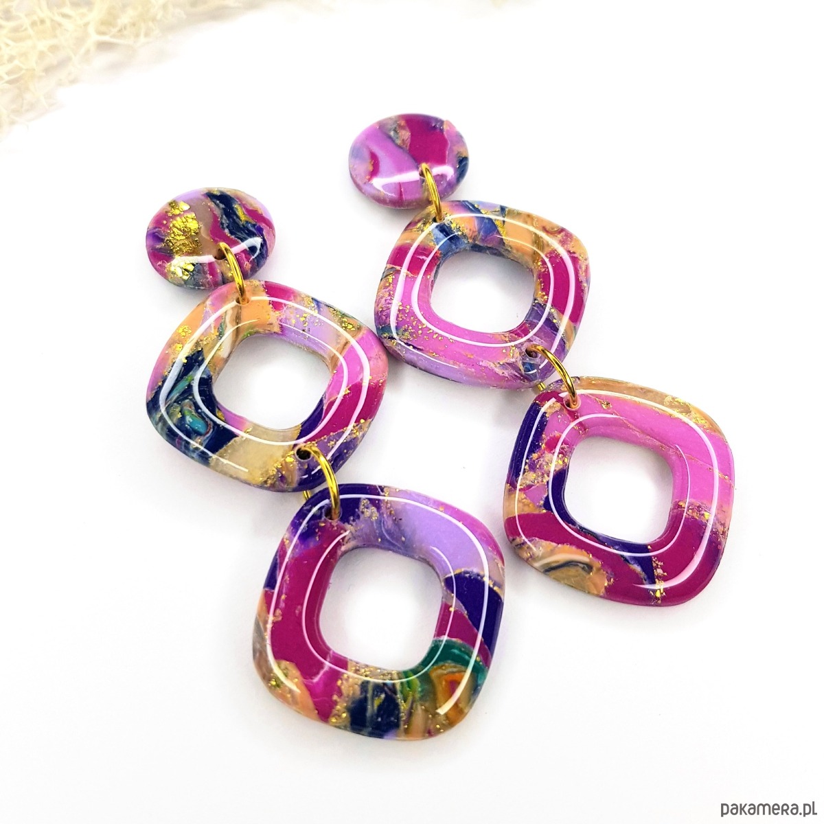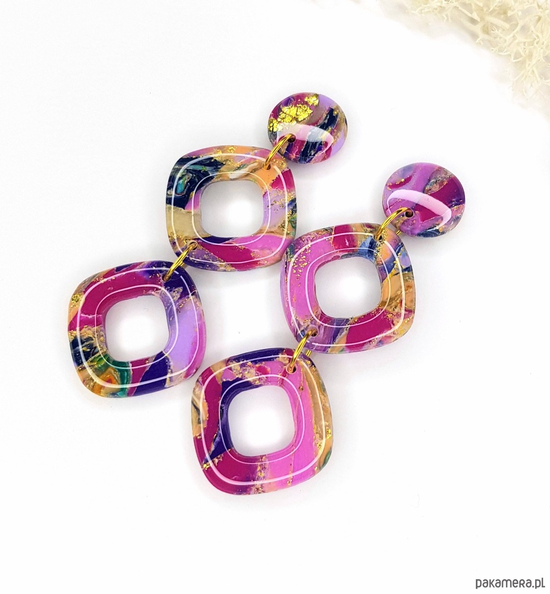 Pięknie przenikające się kolory fuksji oraz złota tworzą efekt trójwymiarowego obrazu, przypominający drogocenny klejnot. Złote drobinki wesoło migoczą przy każdym ruchu, dodając kolczykom subtelnej elegancji i blasku.