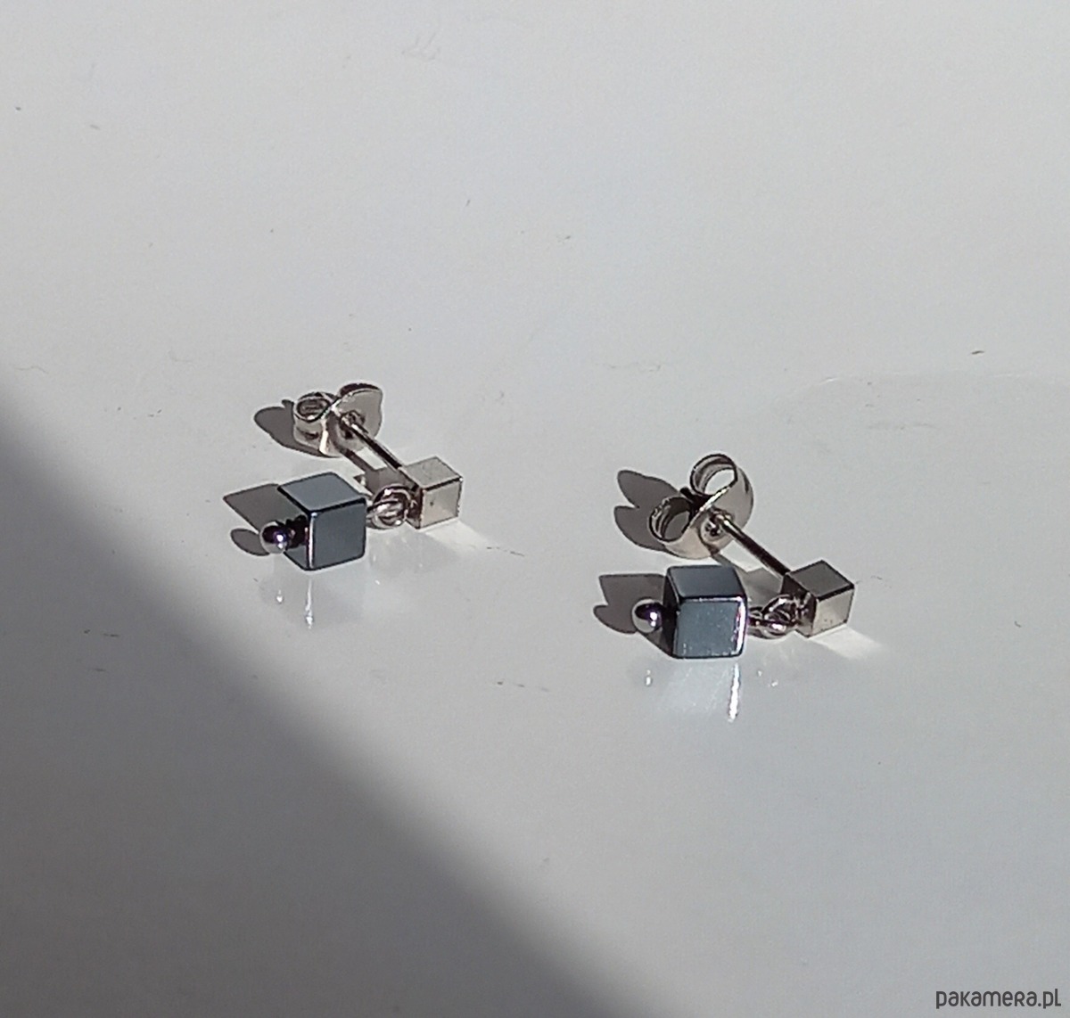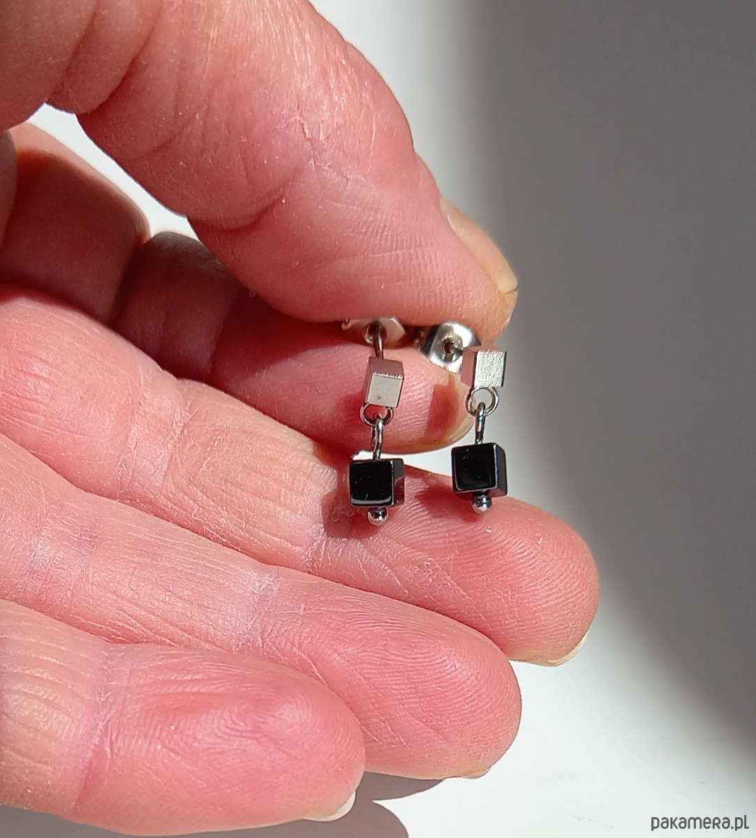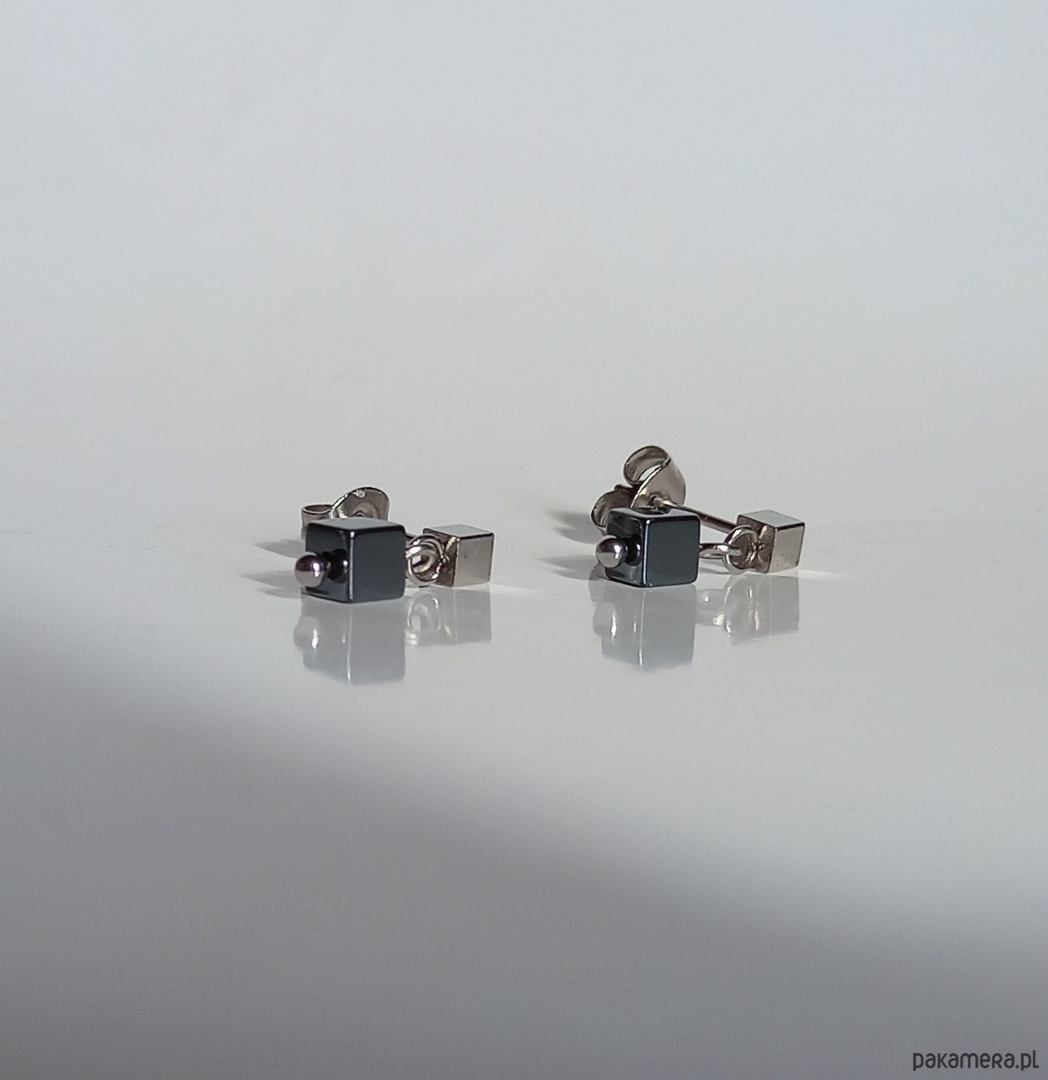 Kolczyki zrobione zostały z niewielkich kostek hematytu, które dołączone zostały do sztyftów również z kostkami ze stali chirurgicznej. Klasyczne kształty, minimalizm i elegancja. Hematytu jest w kolorze stalowym.