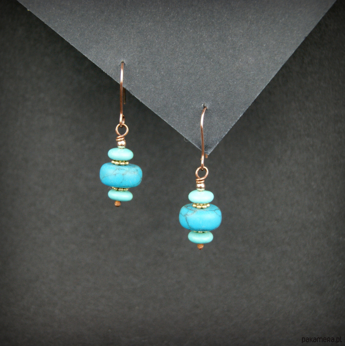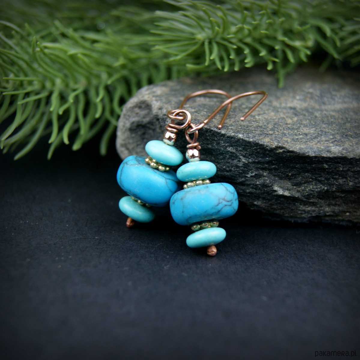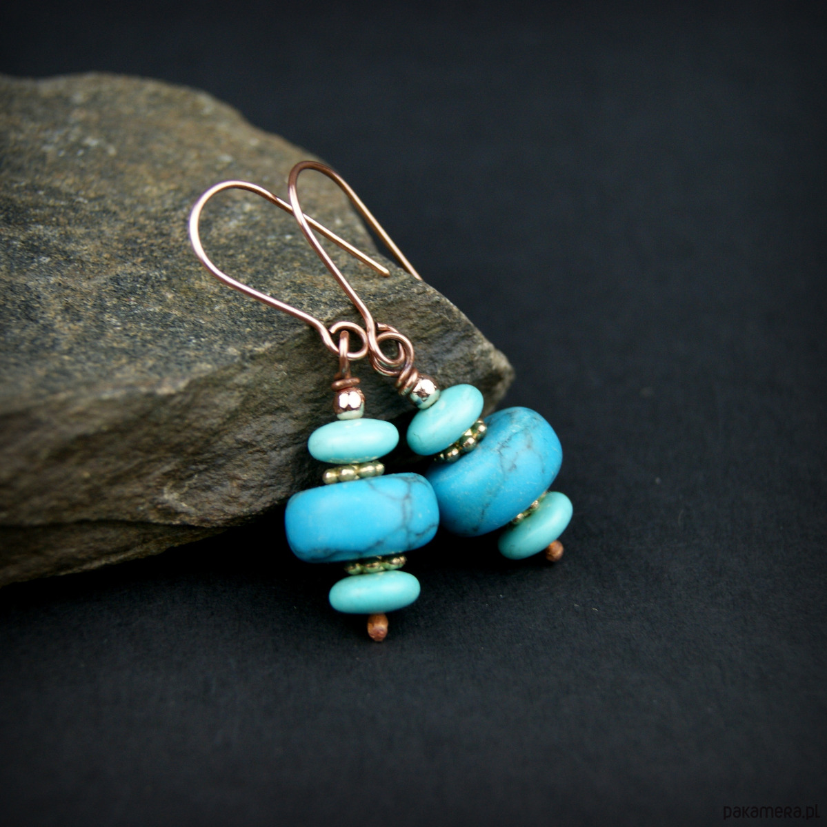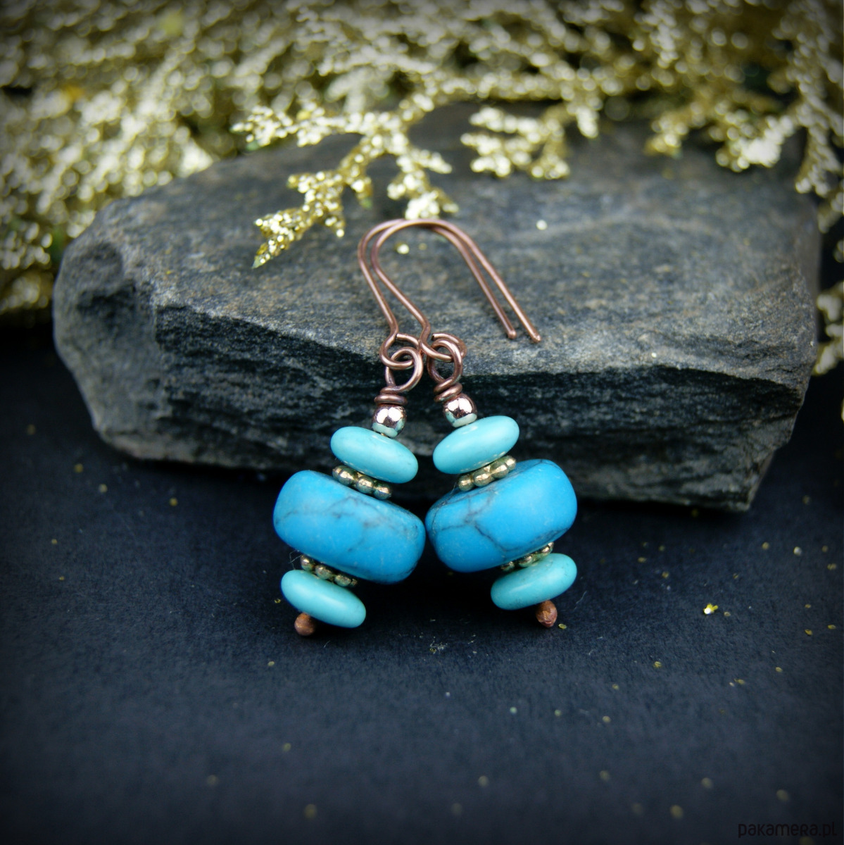 Kolczyki powstały z kamieni turkusu, hematytów oraz miedzi. Bigle miedziane.