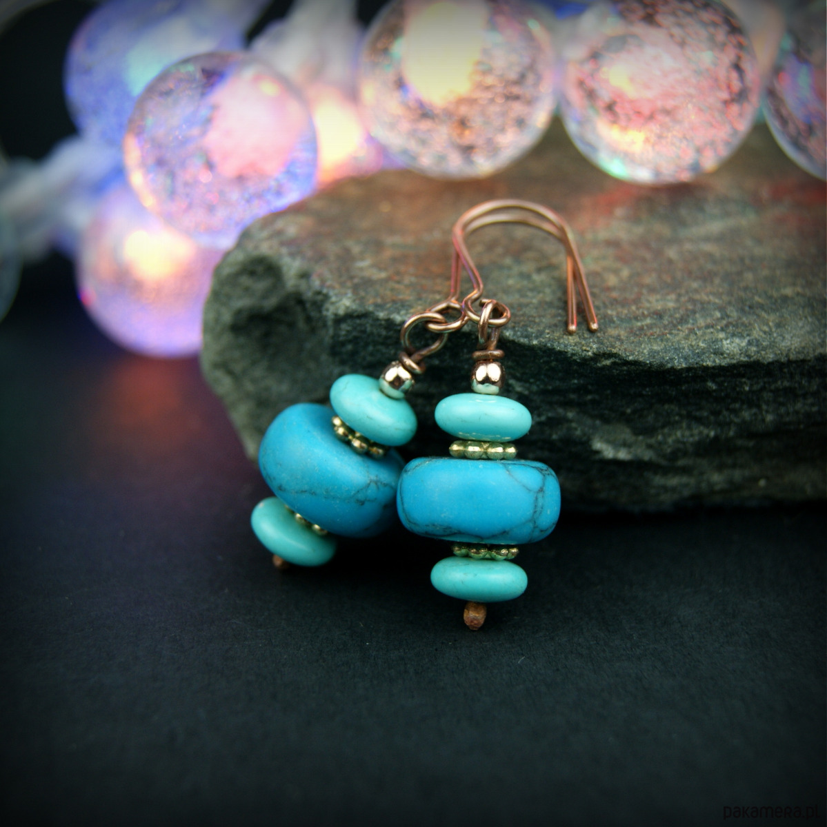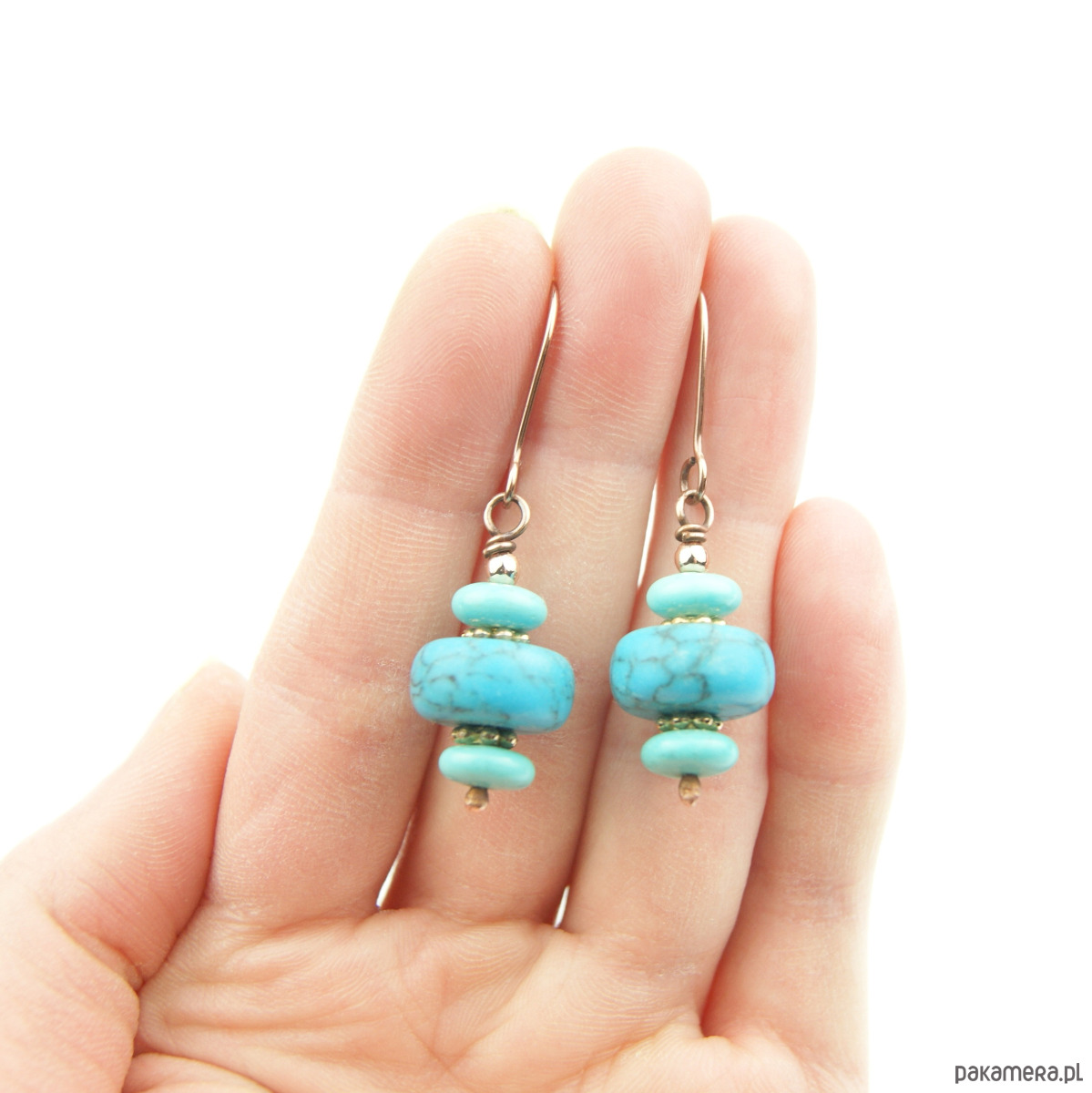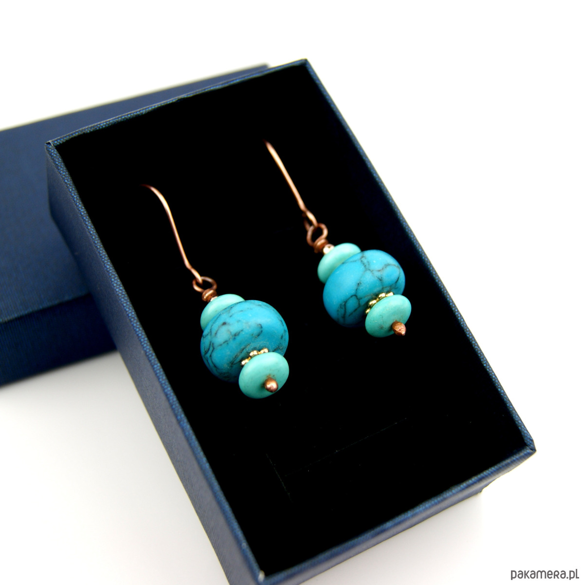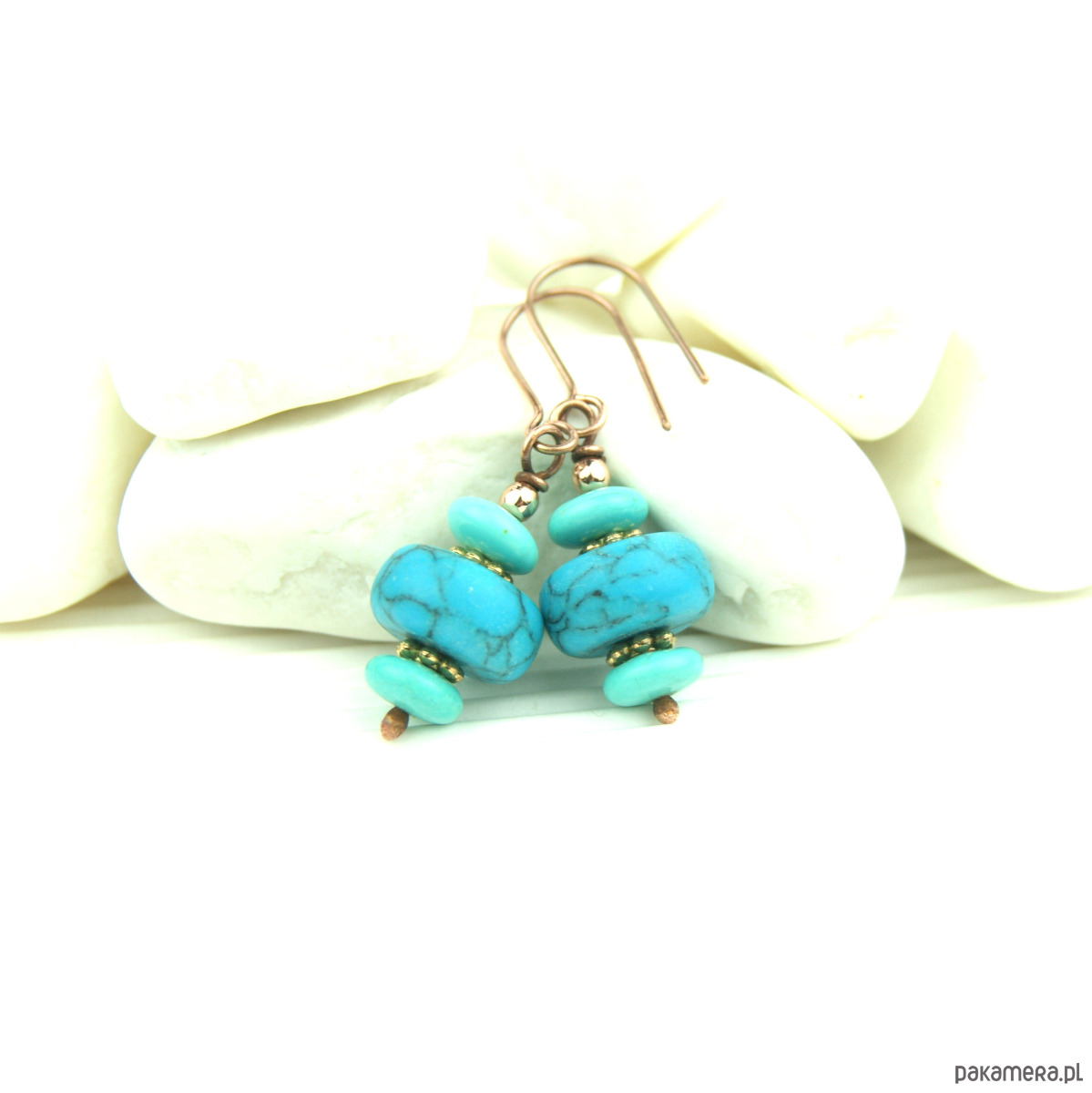 Kolczyki powstały z kamieni turkusu, hematytów oraz miedzi. Bigle miedziane.