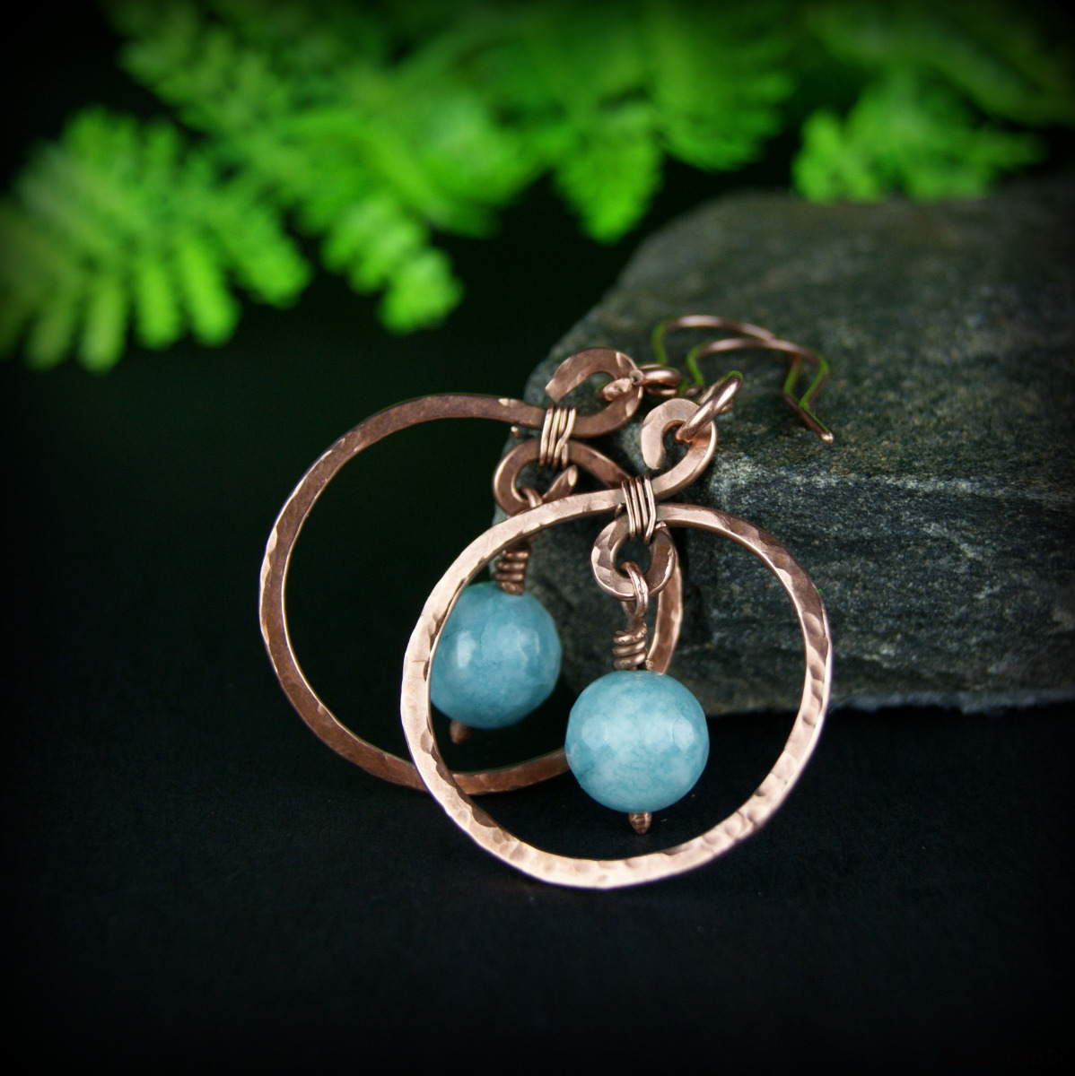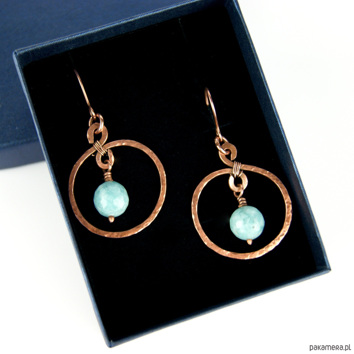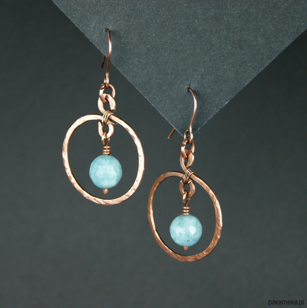 Kolczyki powstały z kamieni jasno turkusowego jadeitu oraz młotkowanej i fakturowanej miedzi. Bigle miedziane.