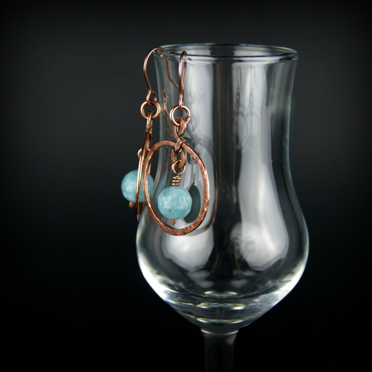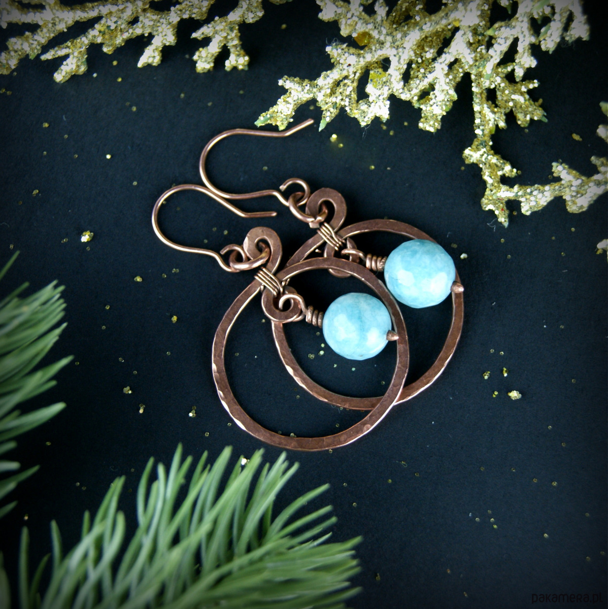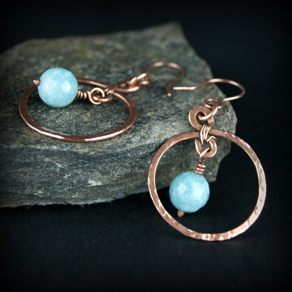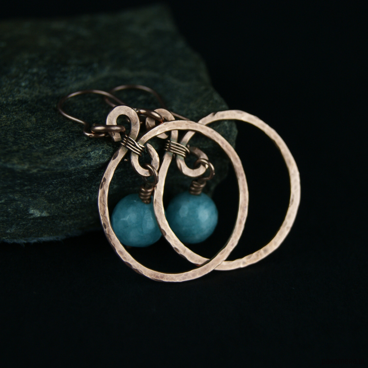 Kolczyki powstały z kamieni jasno turkusowego jadeitu oraz młotkowanej i fakturowanej miedzi. Bigle miedziane.
