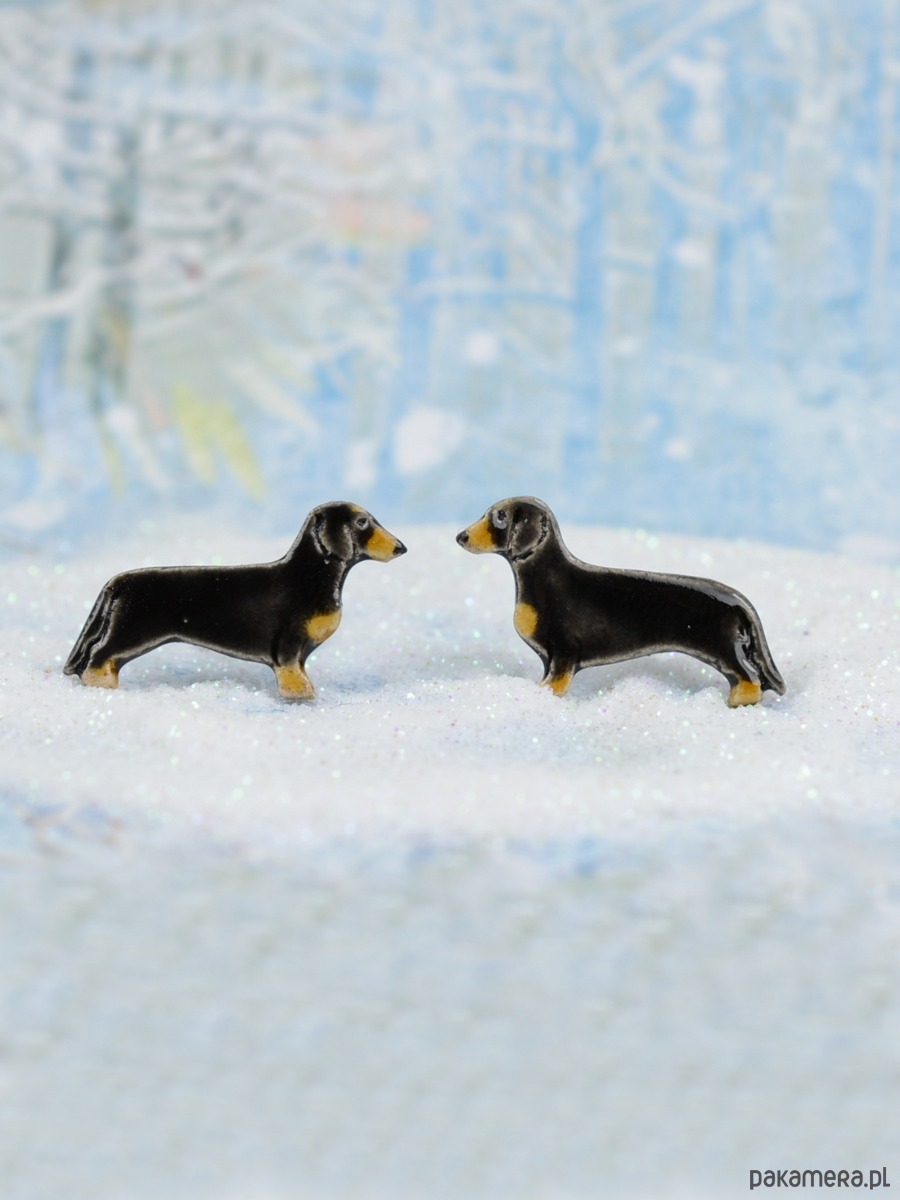 Pieski mają rozmiary: 1,3cm wysokość, 2,2cm szerokość, 1,5mm grubość. Kolczyki wykonuję od podstaw ręcznie:) Każda para jest inna:)))) Jamniki zostały solidnie umocowane na sztyftach ze stali chirurgicznej- antyalergiczna w kolorze oksydowanego srebra. Wysyłam w ozdobnym pudełeczku.