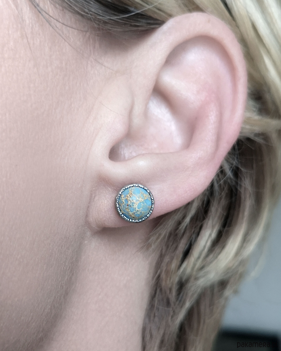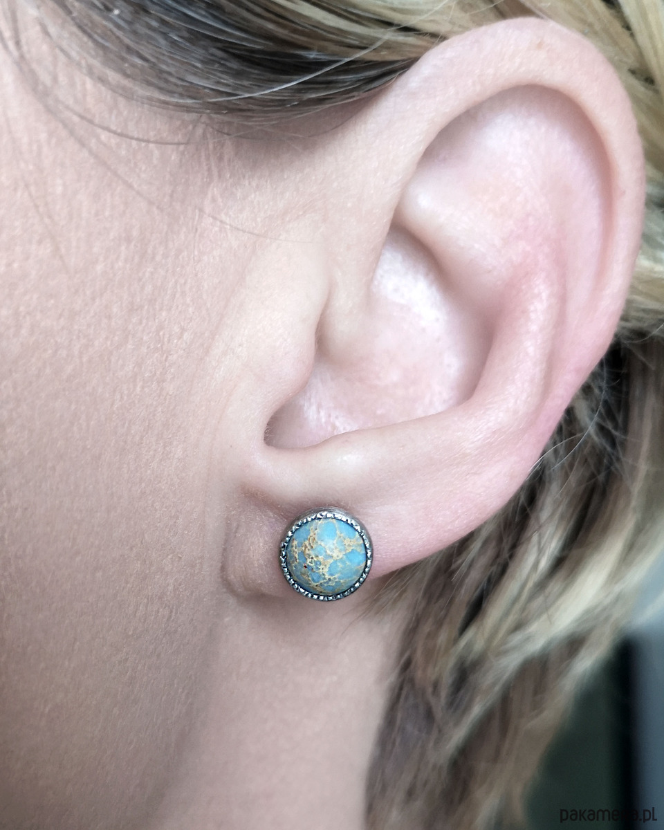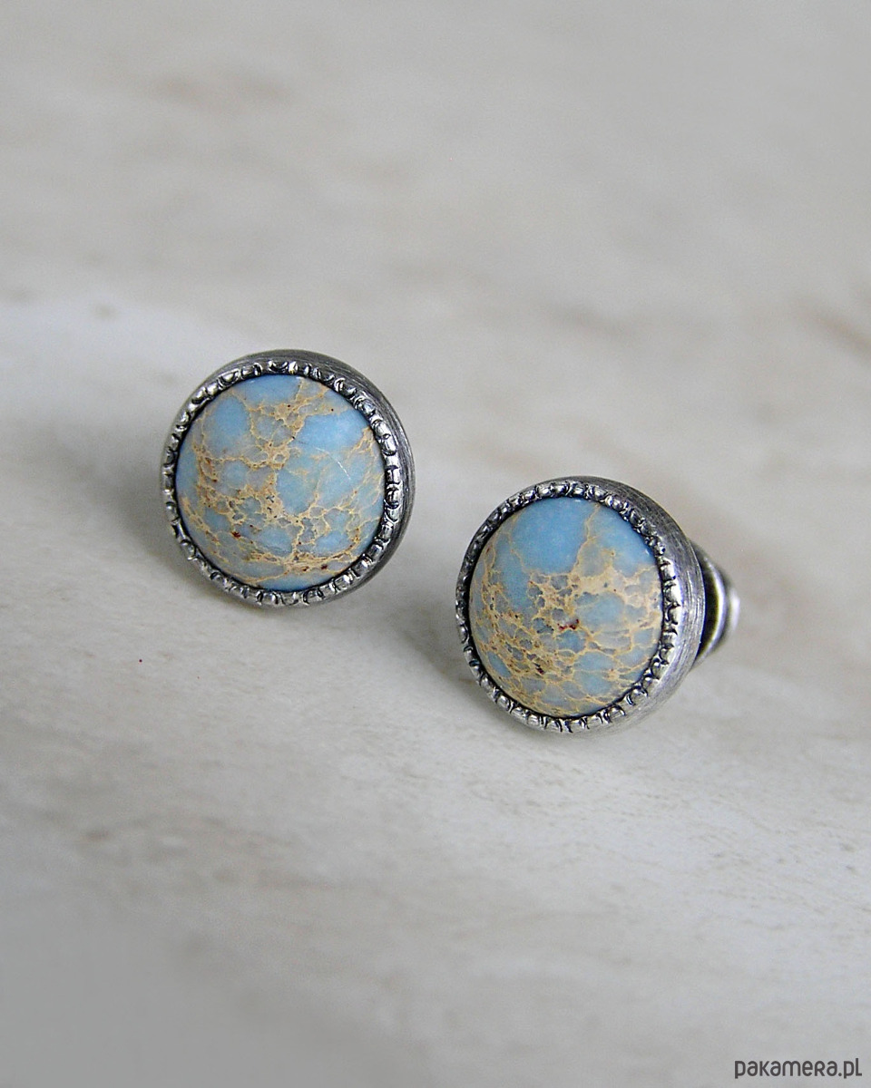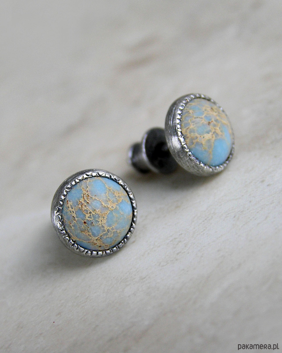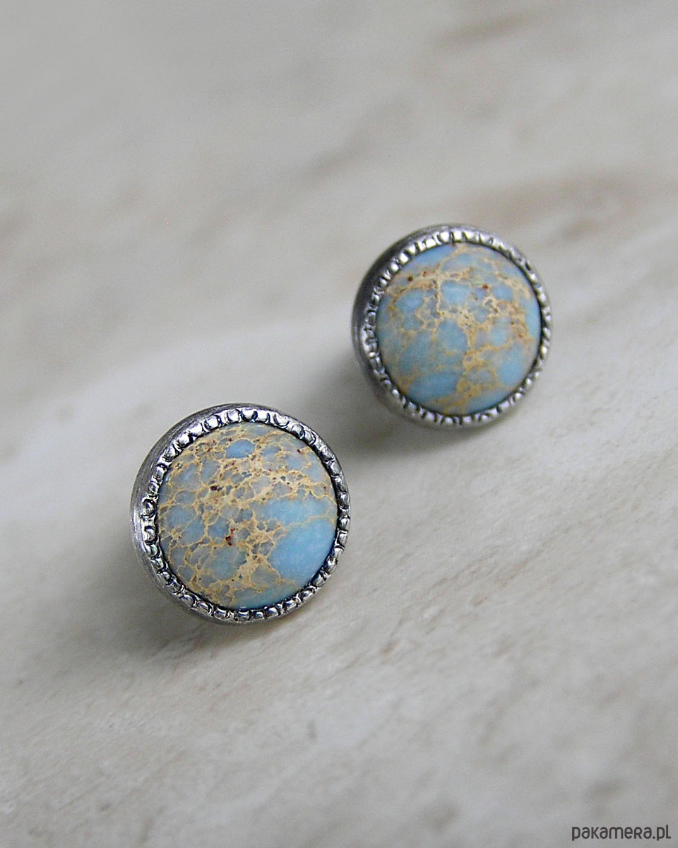 Unikatowe kolczyki wykonane ze srebra 925 z jaspisem oceanicznym w kolorach błękitu i beżu.