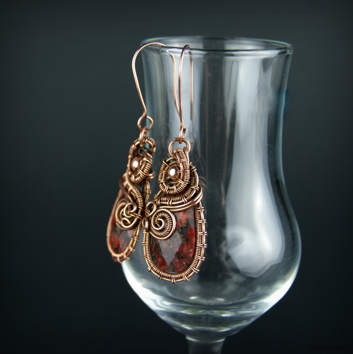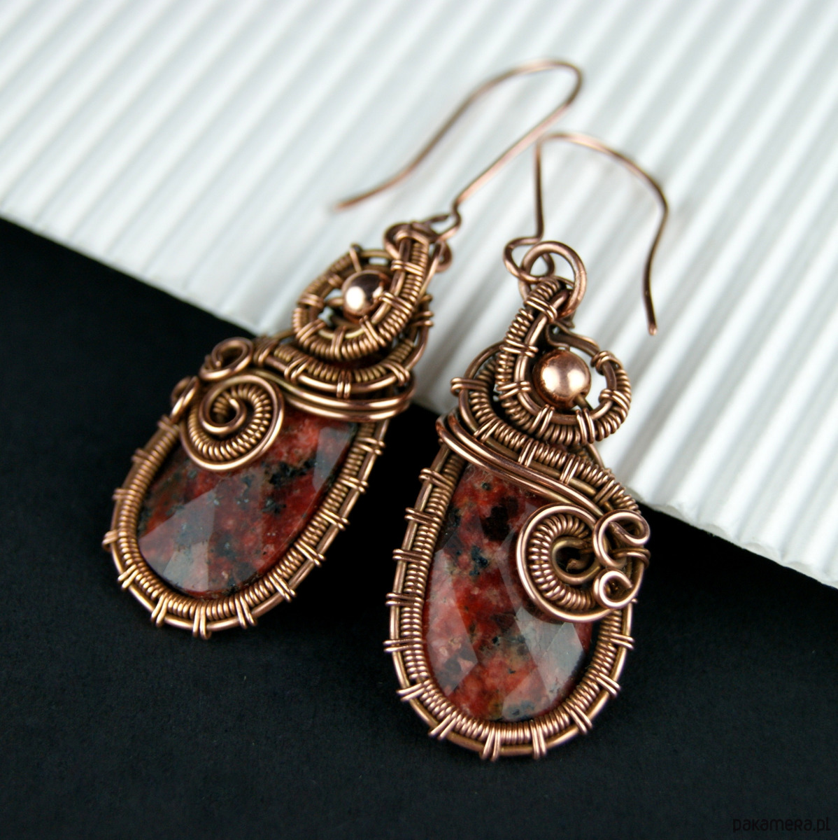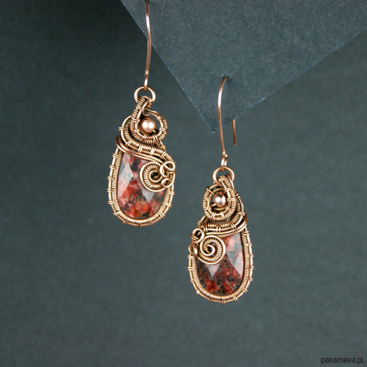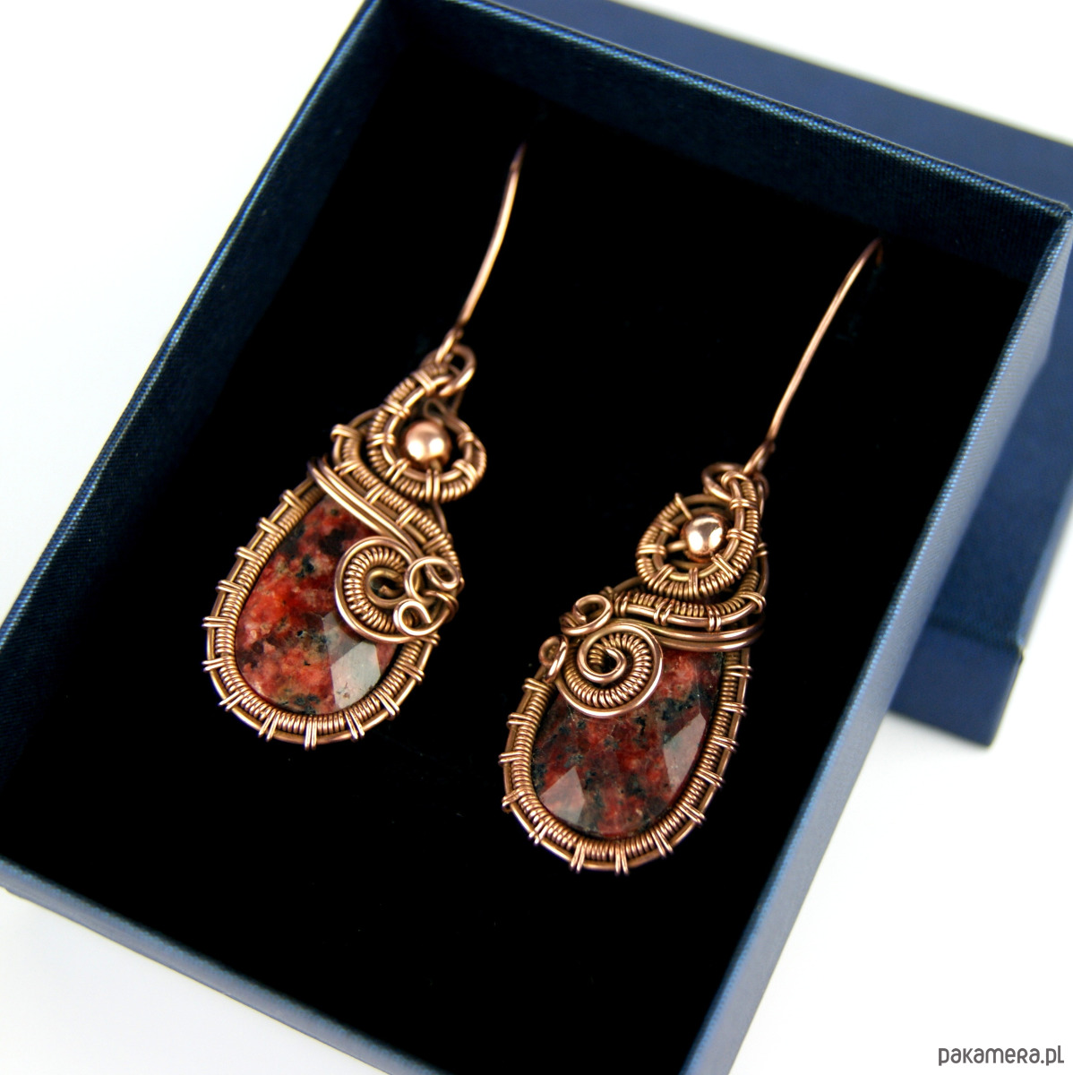 Kolczyki w całości wykonane w technice wire wrapping. Do stworzenia kolczyków użyto fasetowanych kamieni jaspisu w bordowym kolorze, całość misternie opleciono drutem miedzianym, w którym połyskują dodatkowo złote hematyty. Całkowita długość kolczyków to ok 6 cm.