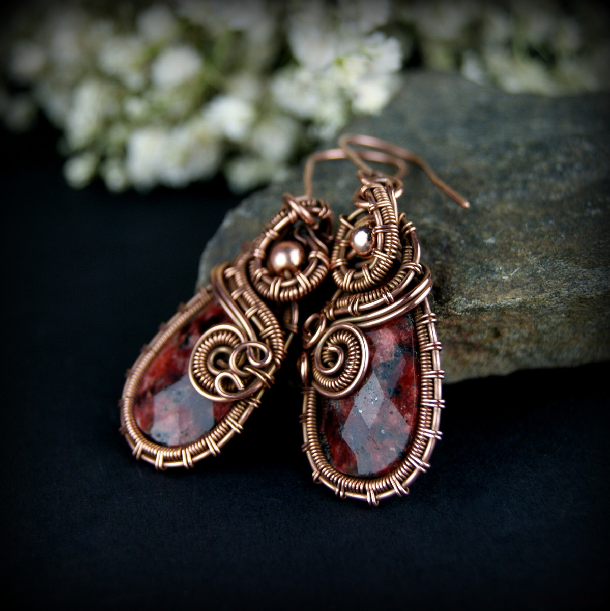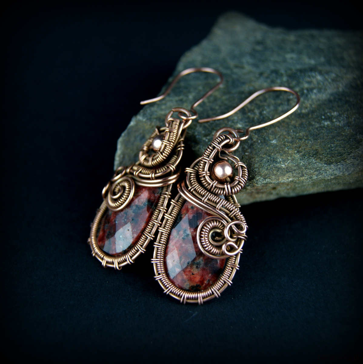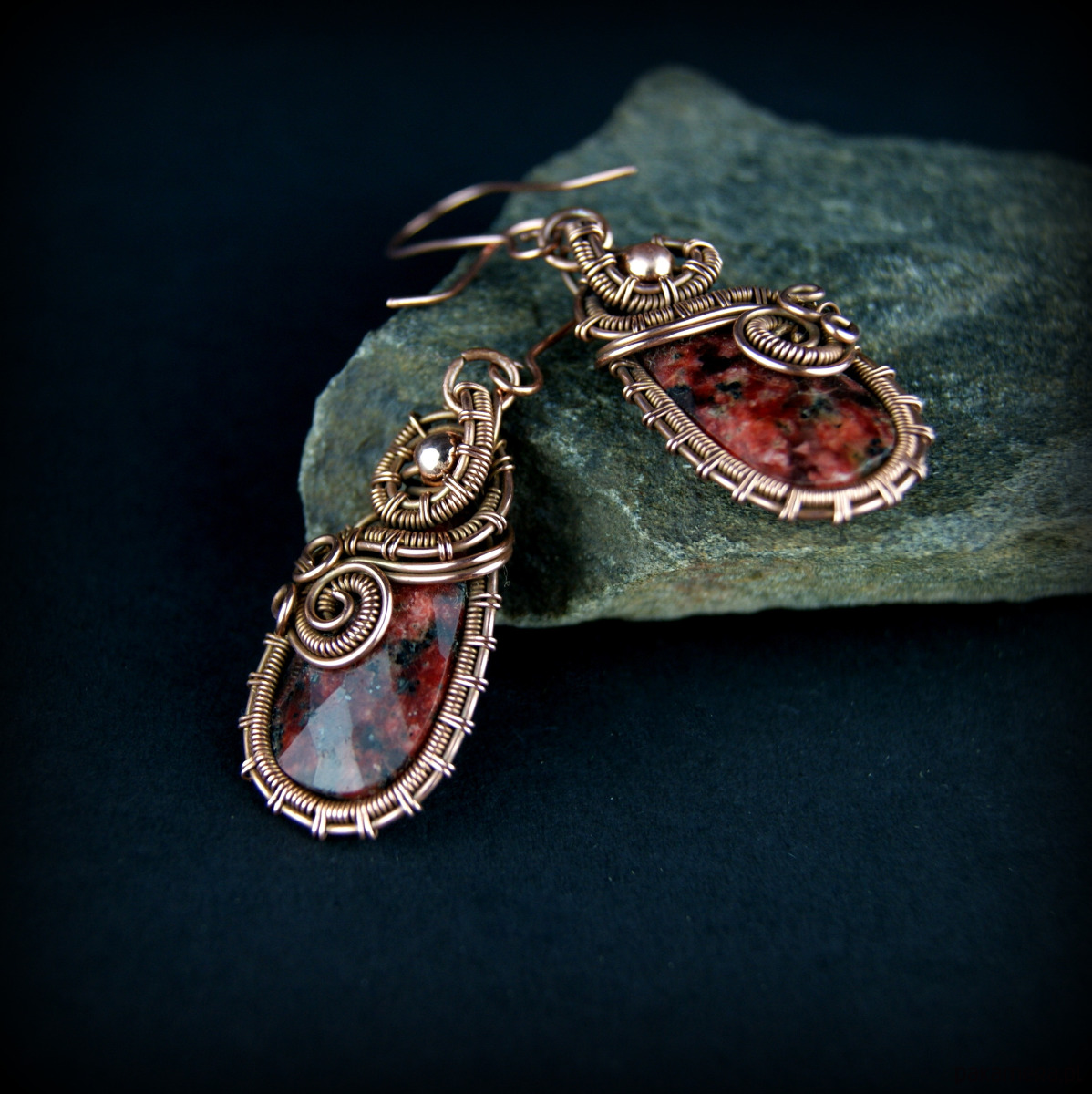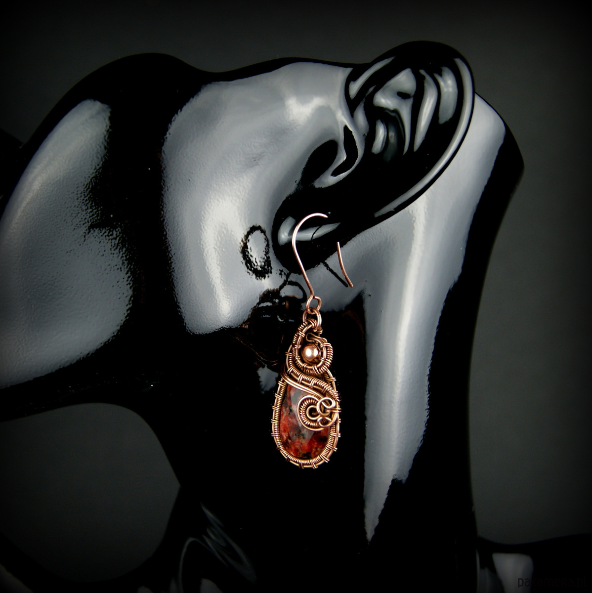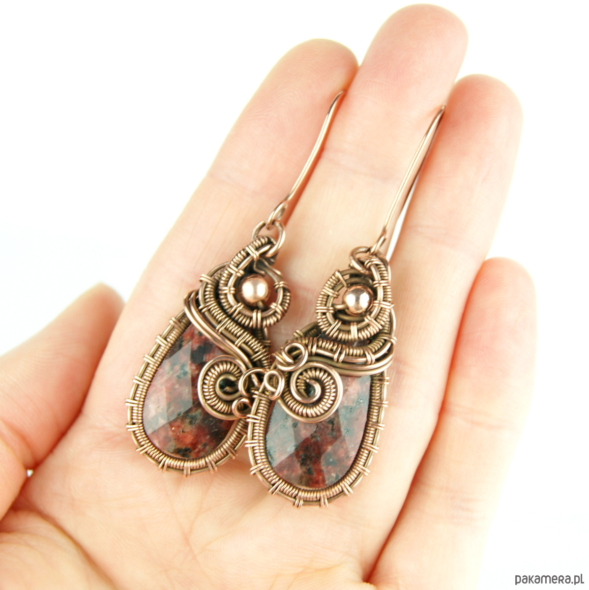 Kolczyki w całości wykonane w technice wire wrapping. Do stworzenia kolczyków użyto fasetowanych kamieni jaspisu w bordowym kolorze, całość misternie opleciono drutem miedzianym, w którym połyskują dodatkowo złote hematyty. Całkowita długość kolczyków to ok 6 cm.