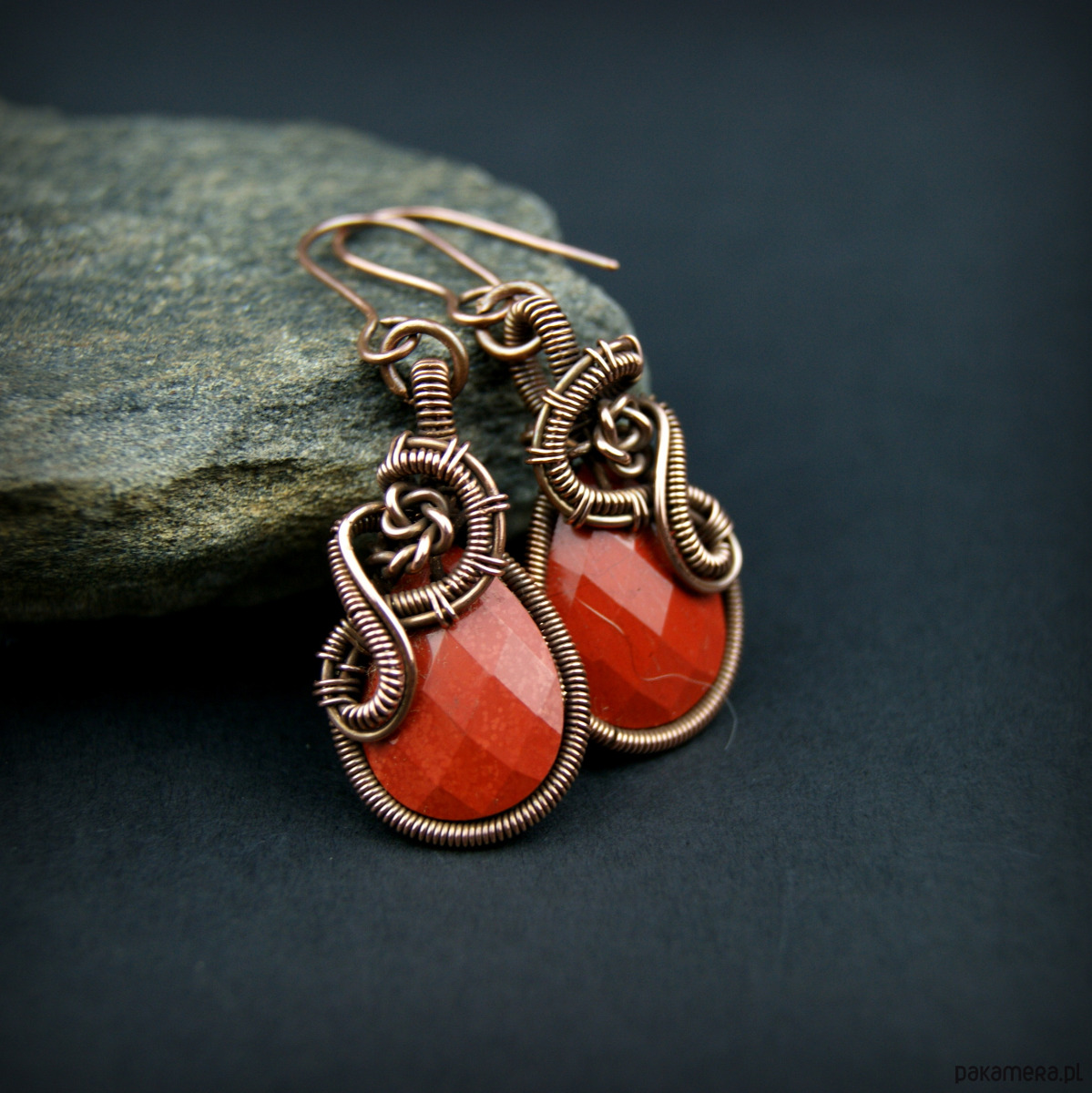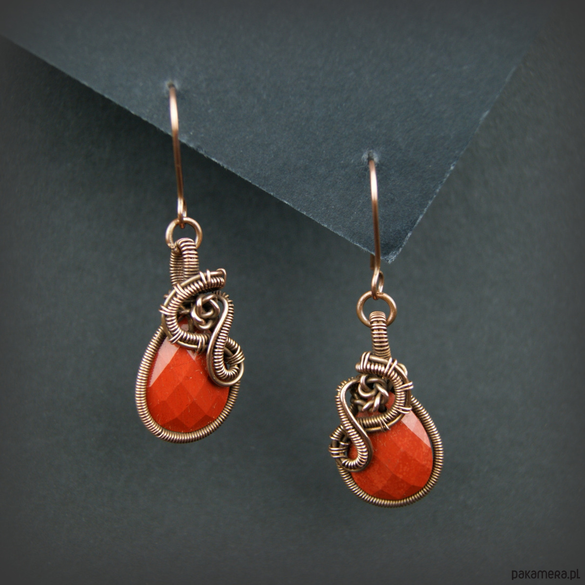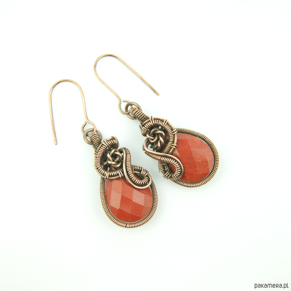 Wiszące kolczyki w całości wykonane z miedzi. Podstawą kolczyków są fasetowane kamienie jaspisu w kształcie łezki. Kamienie otrzymały misternie plecioną, miedzianą oprawę. Bigle miedziane. Biżuteria wykonana techniką wire wrapping, oksydowana.
