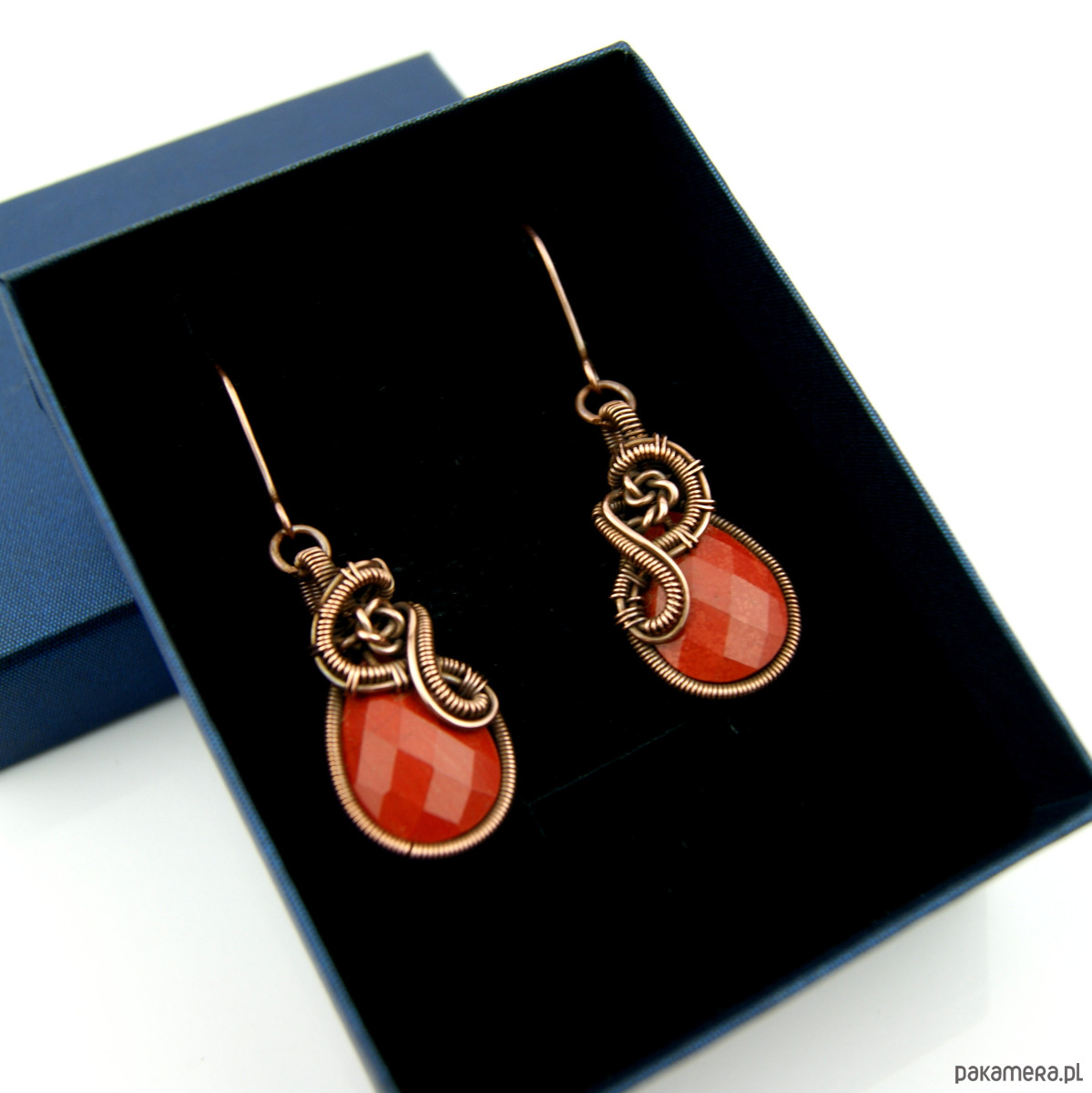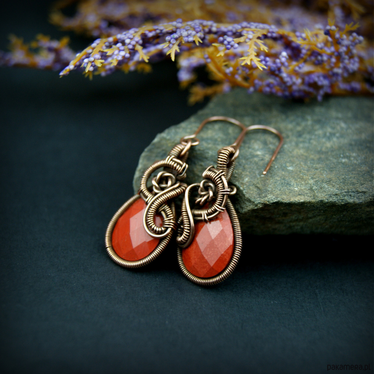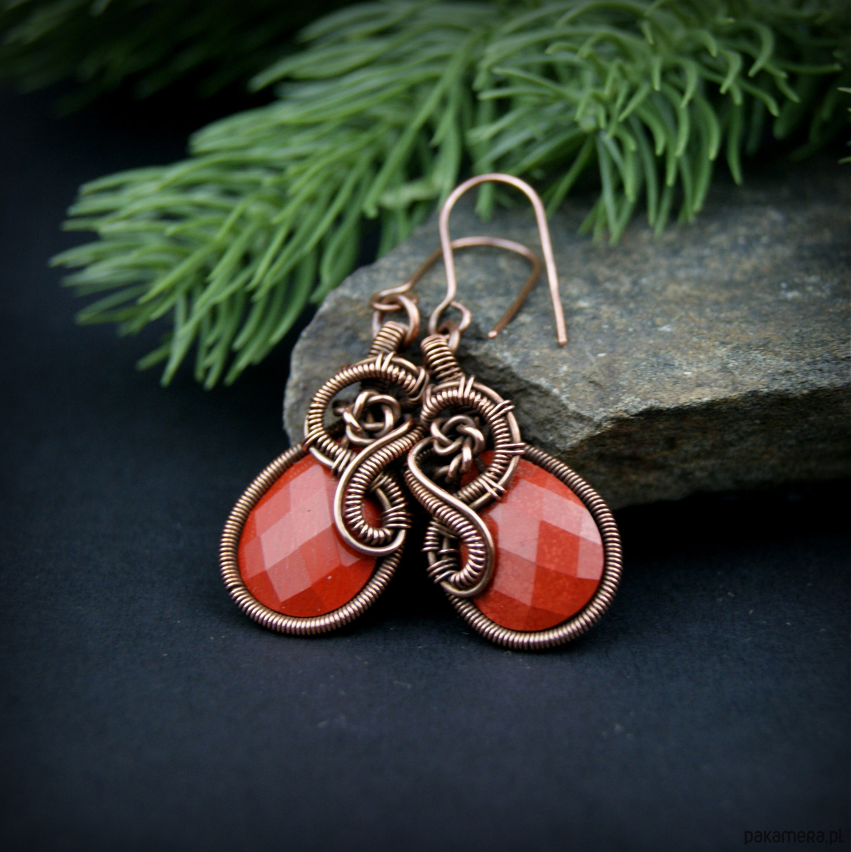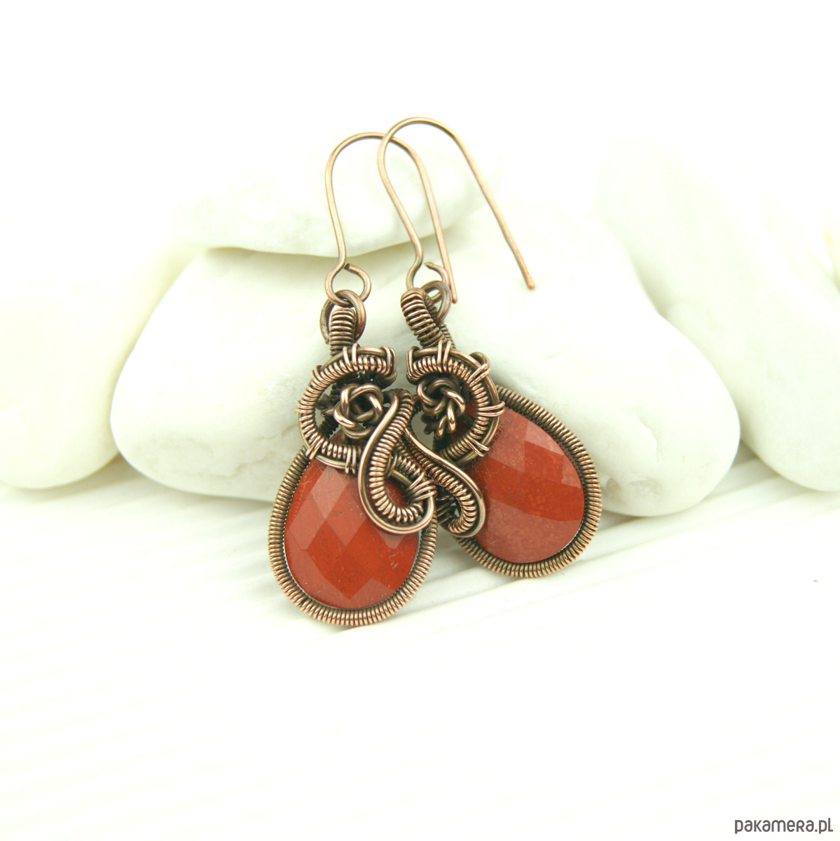 Wiszące kolczyki w całości wykonane z miedzi. Podstawą kolczyków są fasetowane kamienie jaspisu w kształcie łezki. Kamienie otrzymały misternie plecioną, miedzianą oprawę. Bigle miedziane. Biżuteria wykonana techniką wire wrapping, oksydowana.