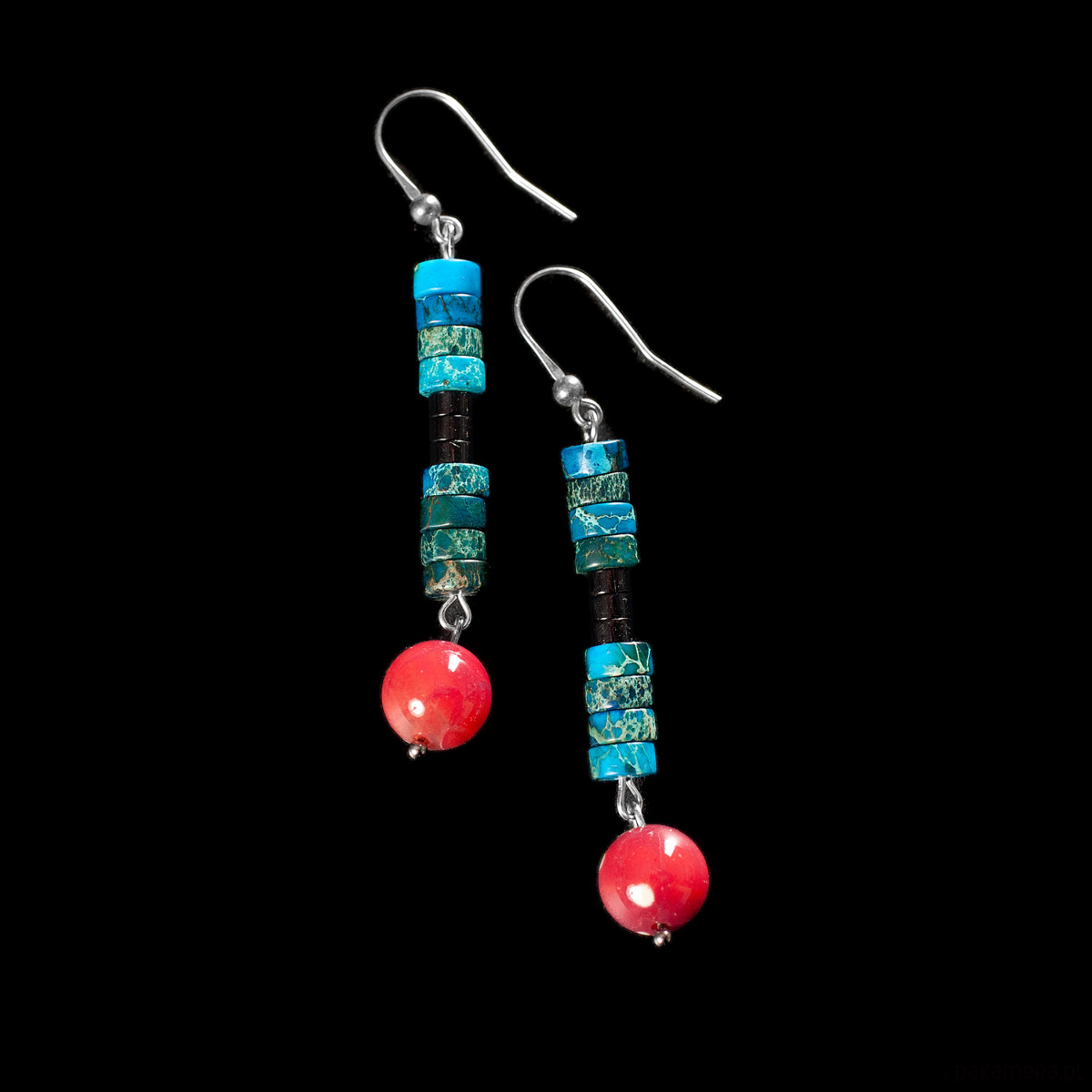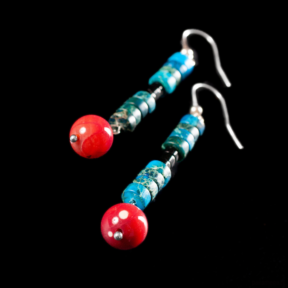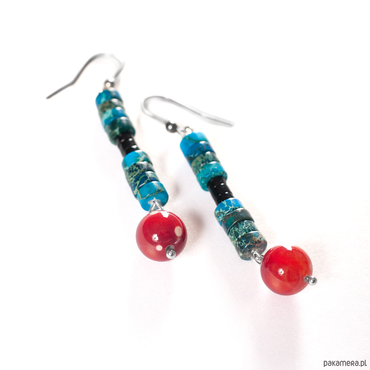 Kolczyki z kolekcji SZAMANKA z jaspisem cesarskim, onyksem i agatem. Matowe koraliki jaspisu cesarskiego zachwycają bogactwem rysunku i kontrastują z połyskliwymi onyksami. Pod nimi, na dole swobodnie podwieszony koralik z agatu wiśniowego. Długość wraz z biglem 7 cm. Bigle - srebro 925. Kolczyki wykonane ręcznie według własnego projektu w pracowni Anillo. Biżuterię przesyłamy w eleganckim kartoniku.