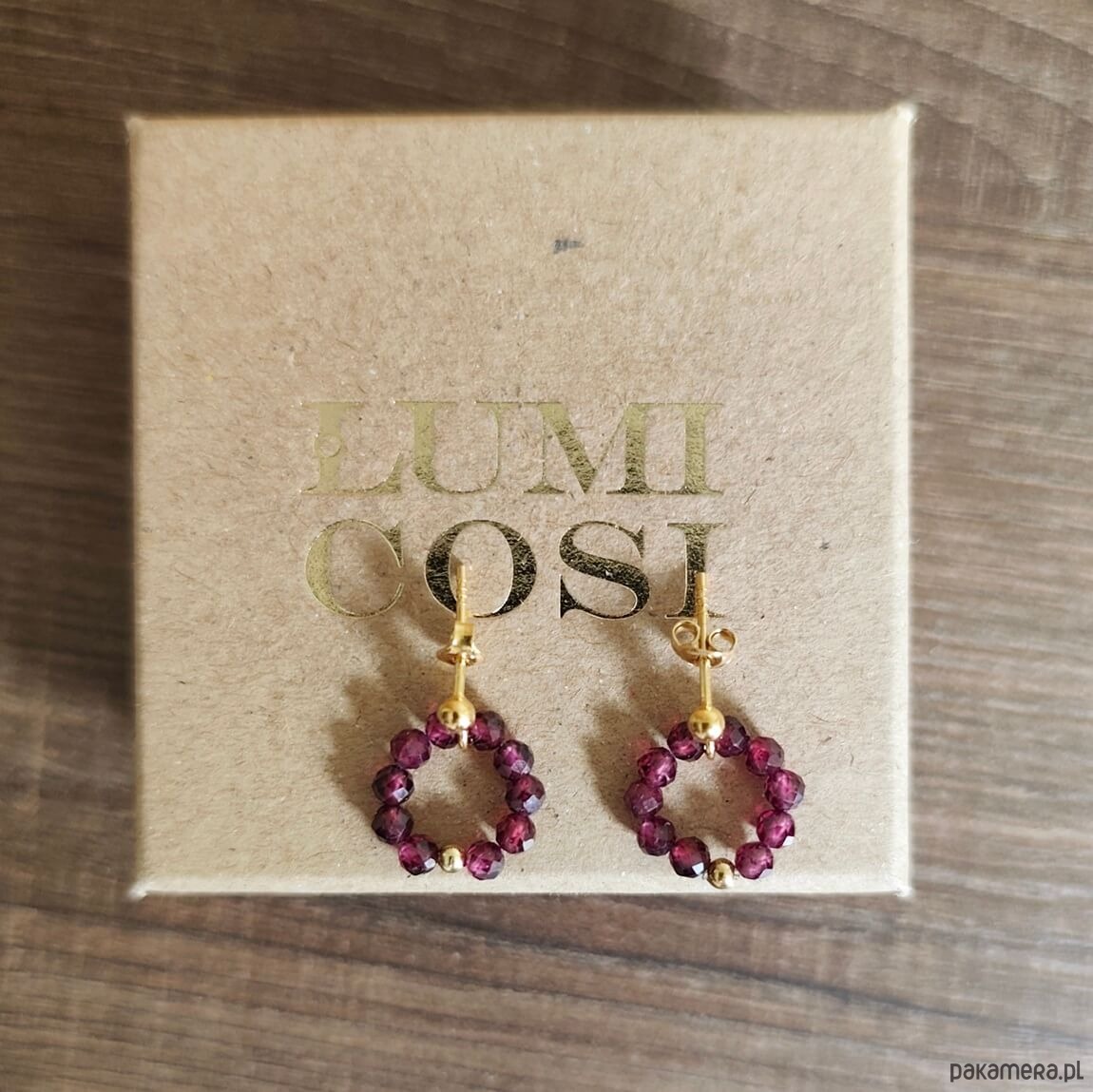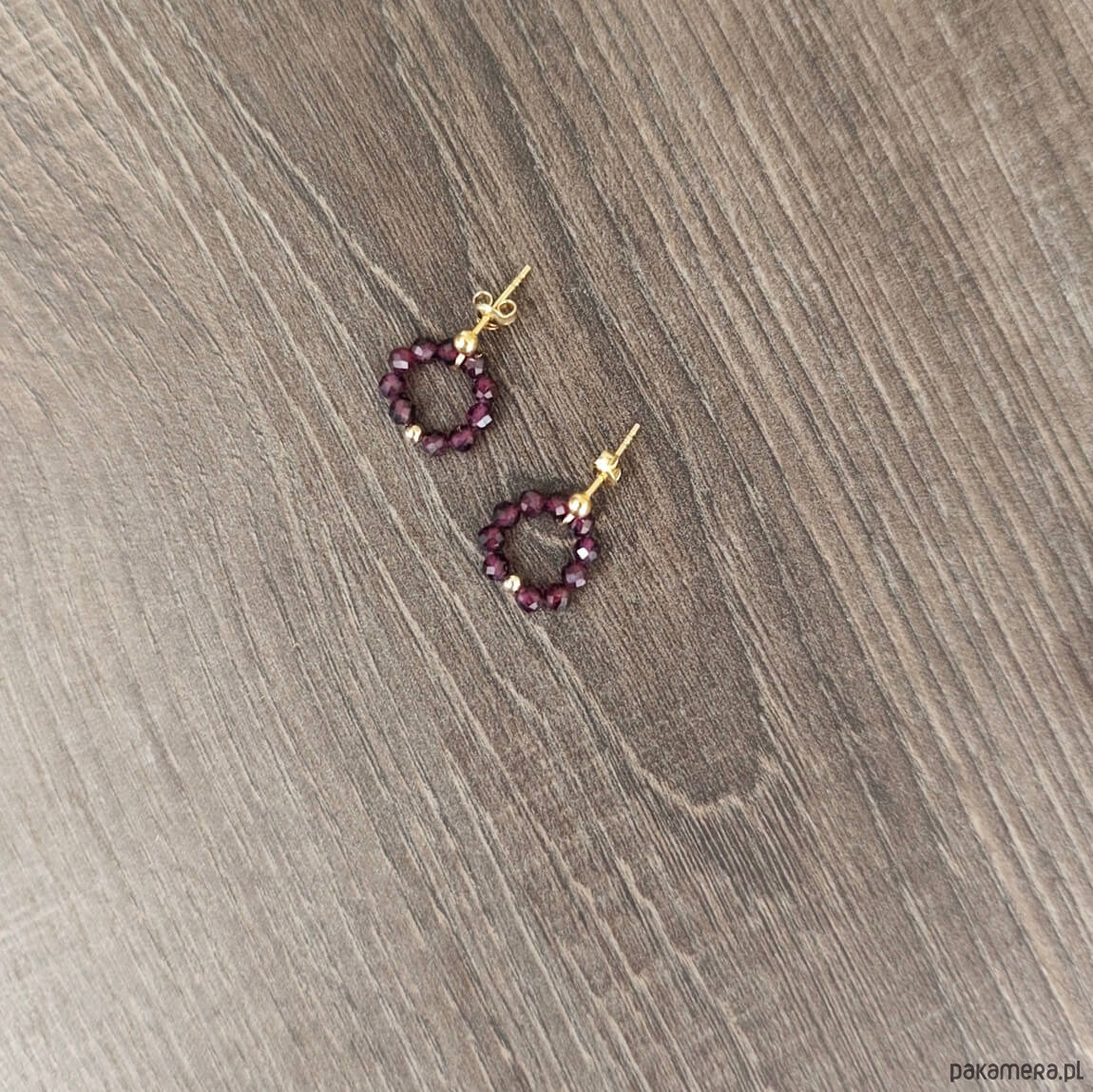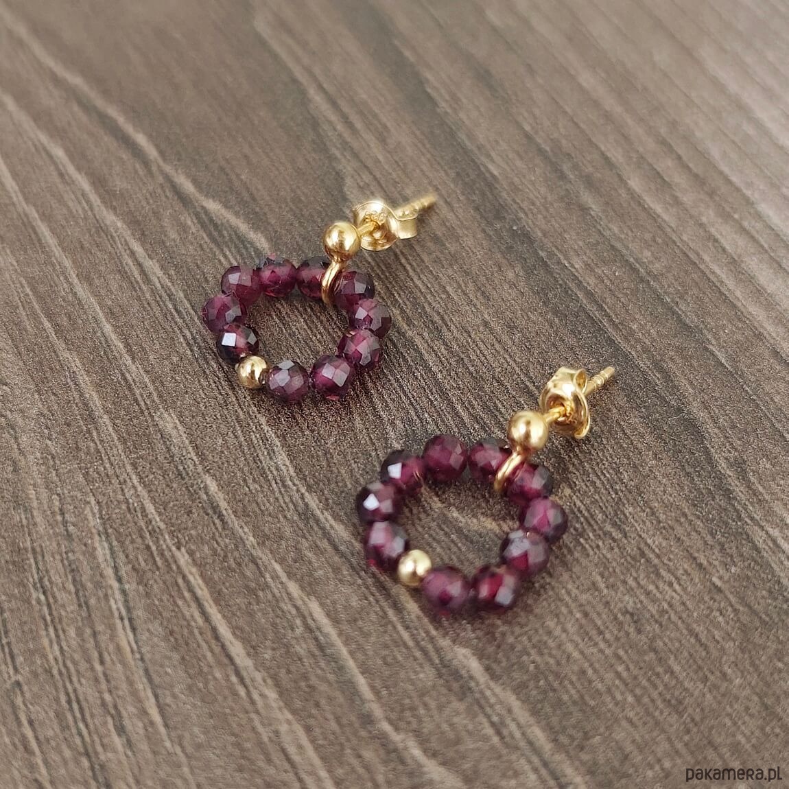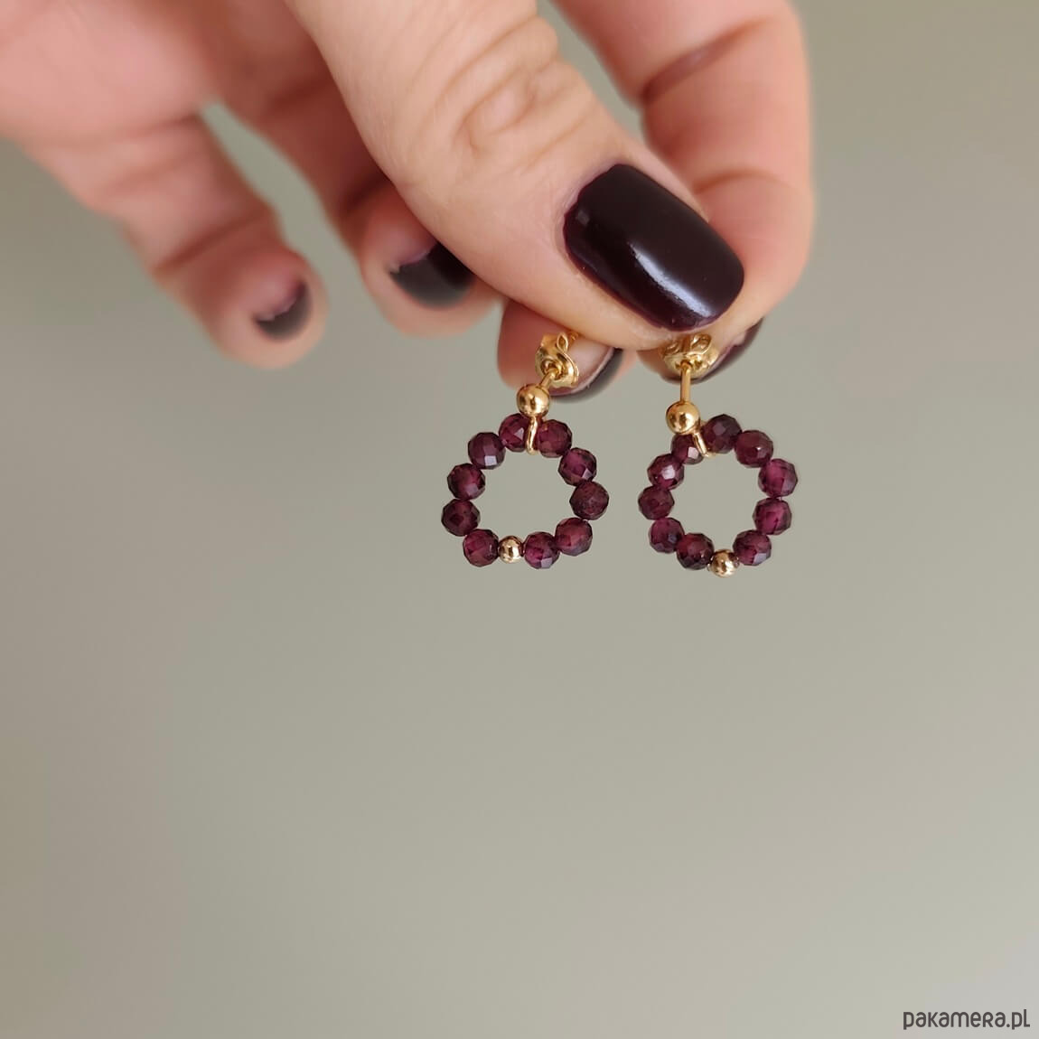 Kolczyki z kamieni granatu to nowoczesna forma biżuterii, w niezwykle zachwycającej winnej czerwieni. Kamienie granatów ułożone w kształcie kółka, osadzone na sztyfcie zapinanym z tyłu klasyczną zatyczką. Na środku subtelna pozłacana kuleczka.