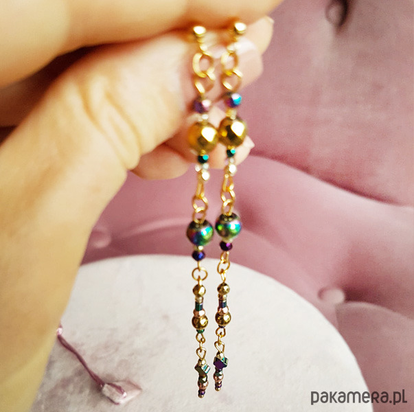 Kolczyki są przygotowane z hematytów w różnych kształtach i baśniowym ubarwieniu.