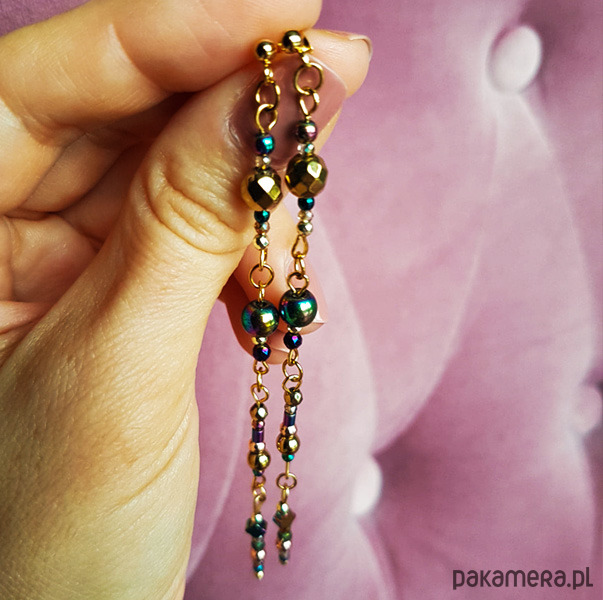Kolczyki są przygotowane z hematytów w różnych kształtach i baśniowym ubarwieniu.