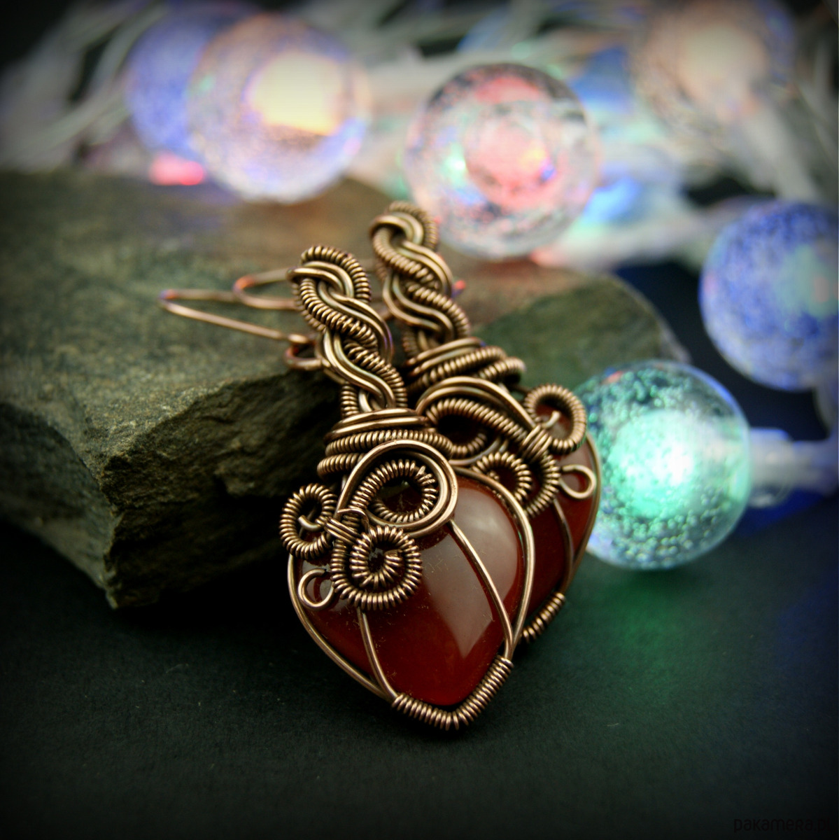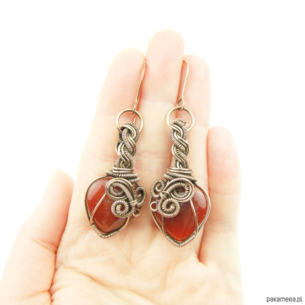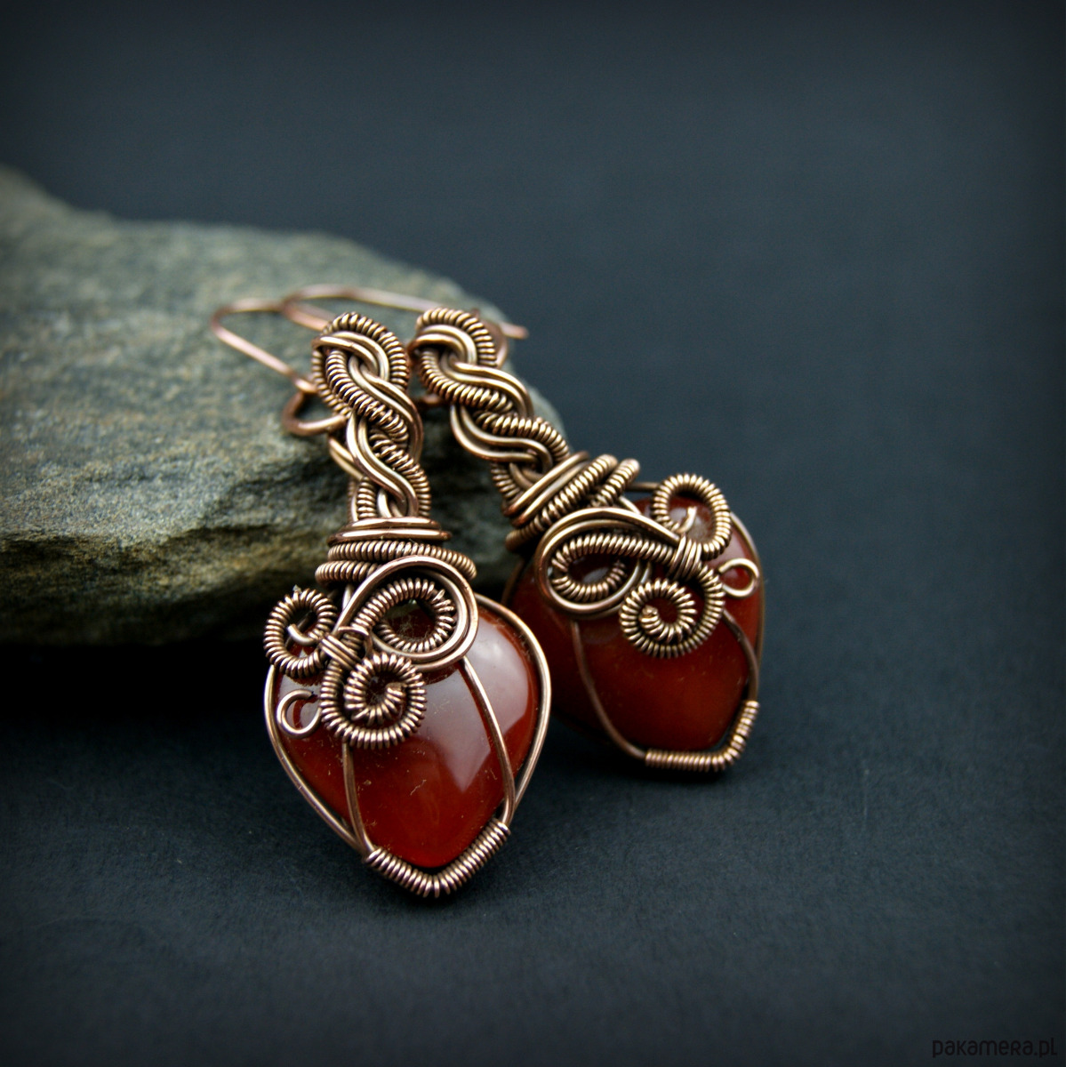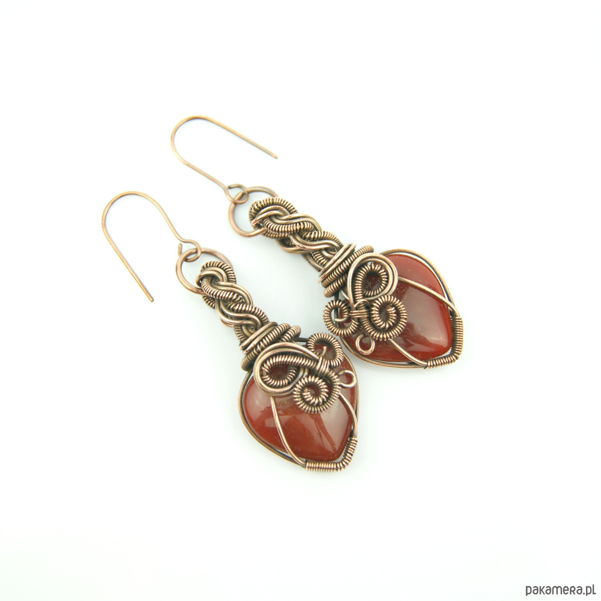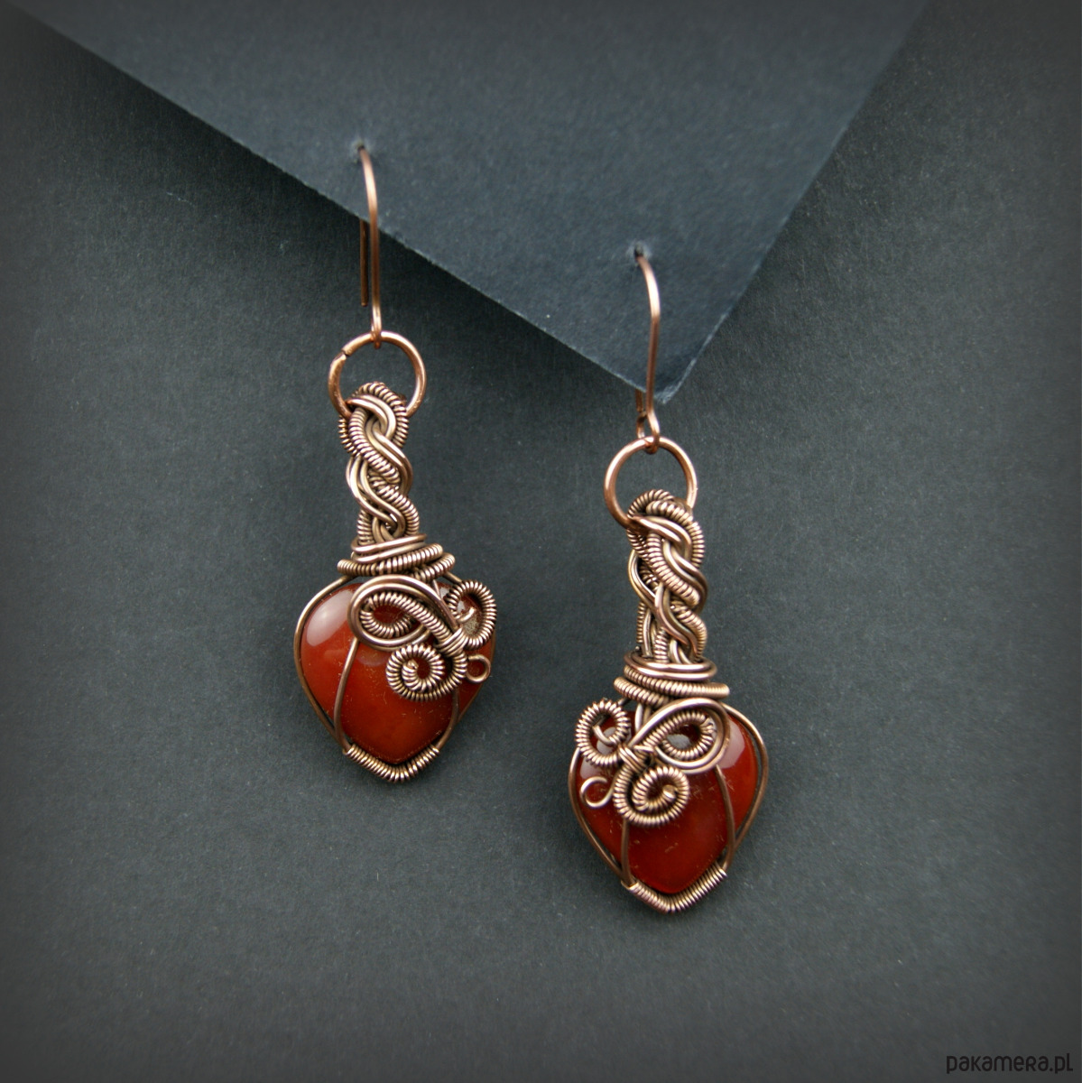 Wiszące kolczyki w całości wykonane z miedzi. Podstawą kolczyków są kamienie karneolu w kształcie serduszek. Kamienie otrzymały misternie plecioną, miedzianą oprawę. Bigle miedziane. Biżuteria wykonana techniką wire wrapping, oksydowana.