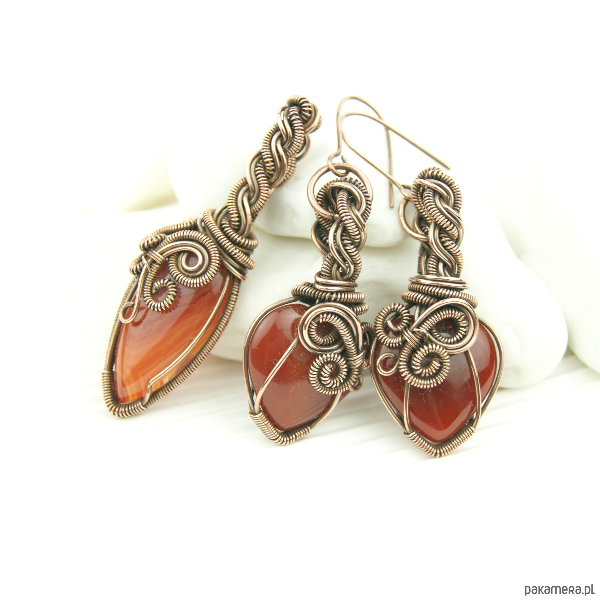 Materiał: karneol, miedziany drut jubilerski.