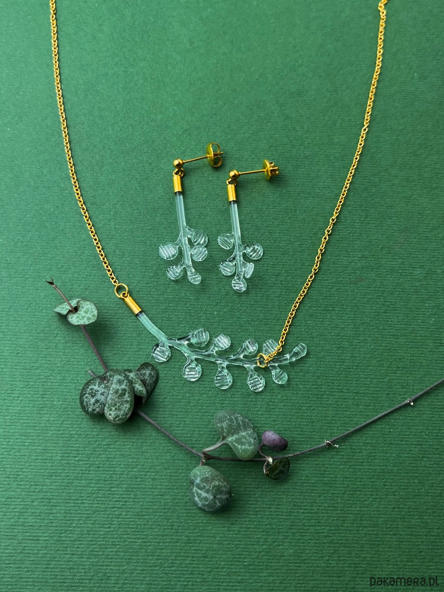 Biżuteria wykonana ręcznie ze szkła borokrzemowego. Ze względu na charakter wykonania model w zamówieniu może nieznacznie różnić się od zdjęcia układem listków oraz długością.