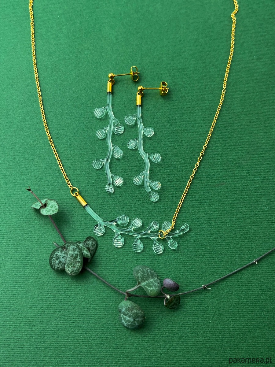 Biżuteria wykonana ręcznie ze szkła borokrzemowego. Ze względu na charakter wykonania model w zamówieniu może nieznacznie różnić się od zdjęcia układem listków oraz długością.