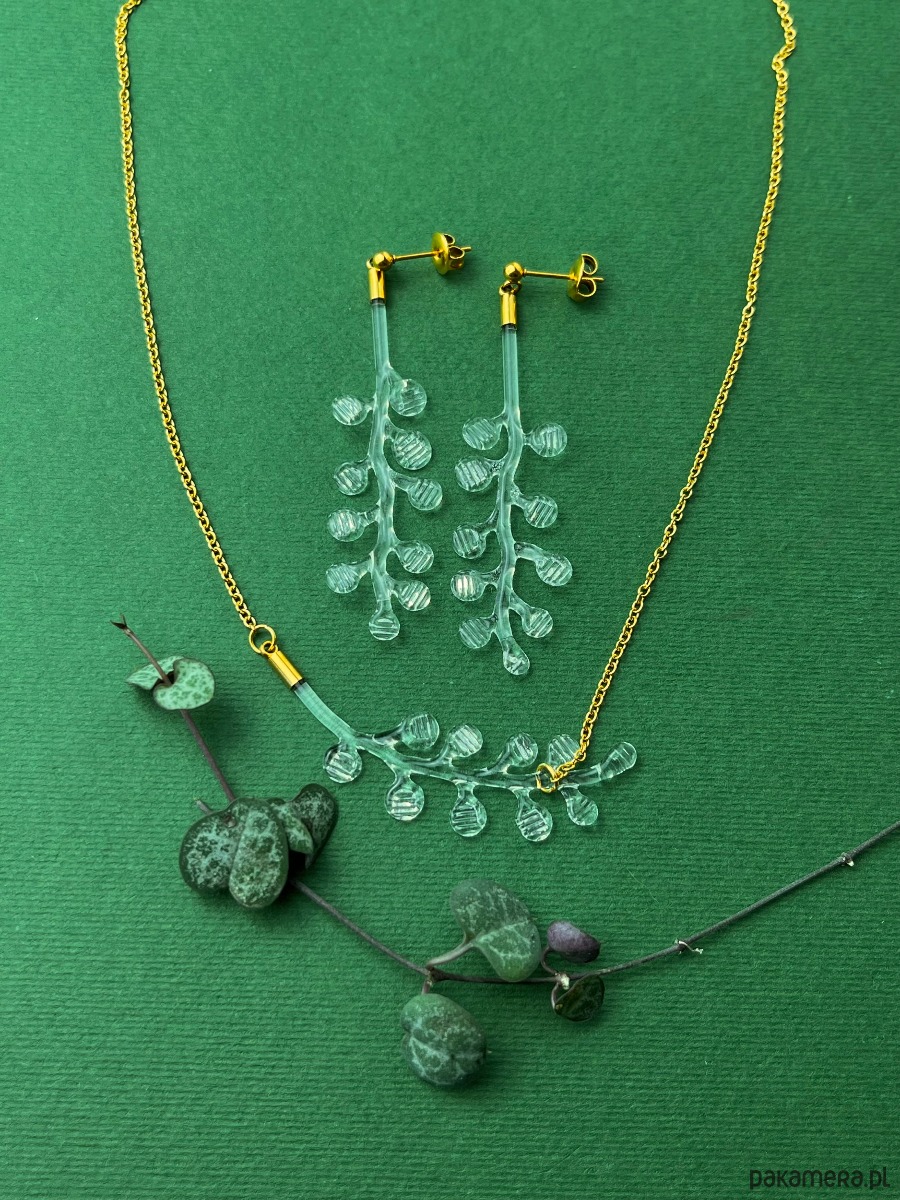 Biżuteria wykonana ręcznie ze szkła borokrzemowego. Ze względu na charakter wykonania model w zamówieniu może nieznacznie różnić się od zdjęcia układem listków oraz długością.
