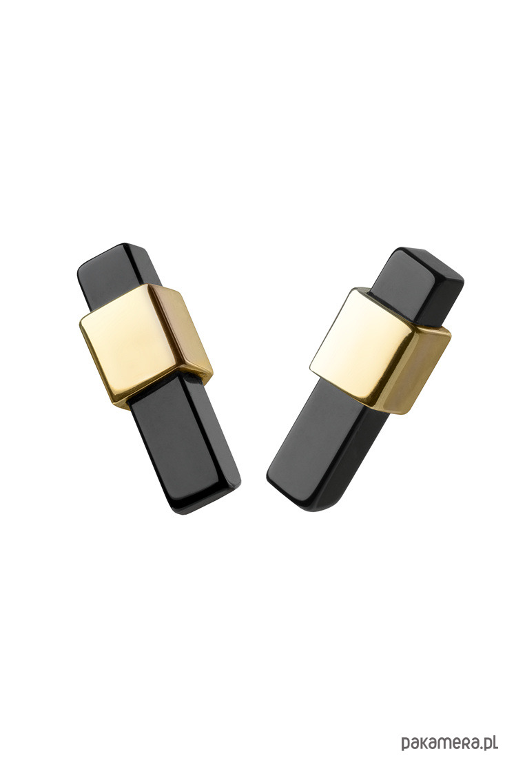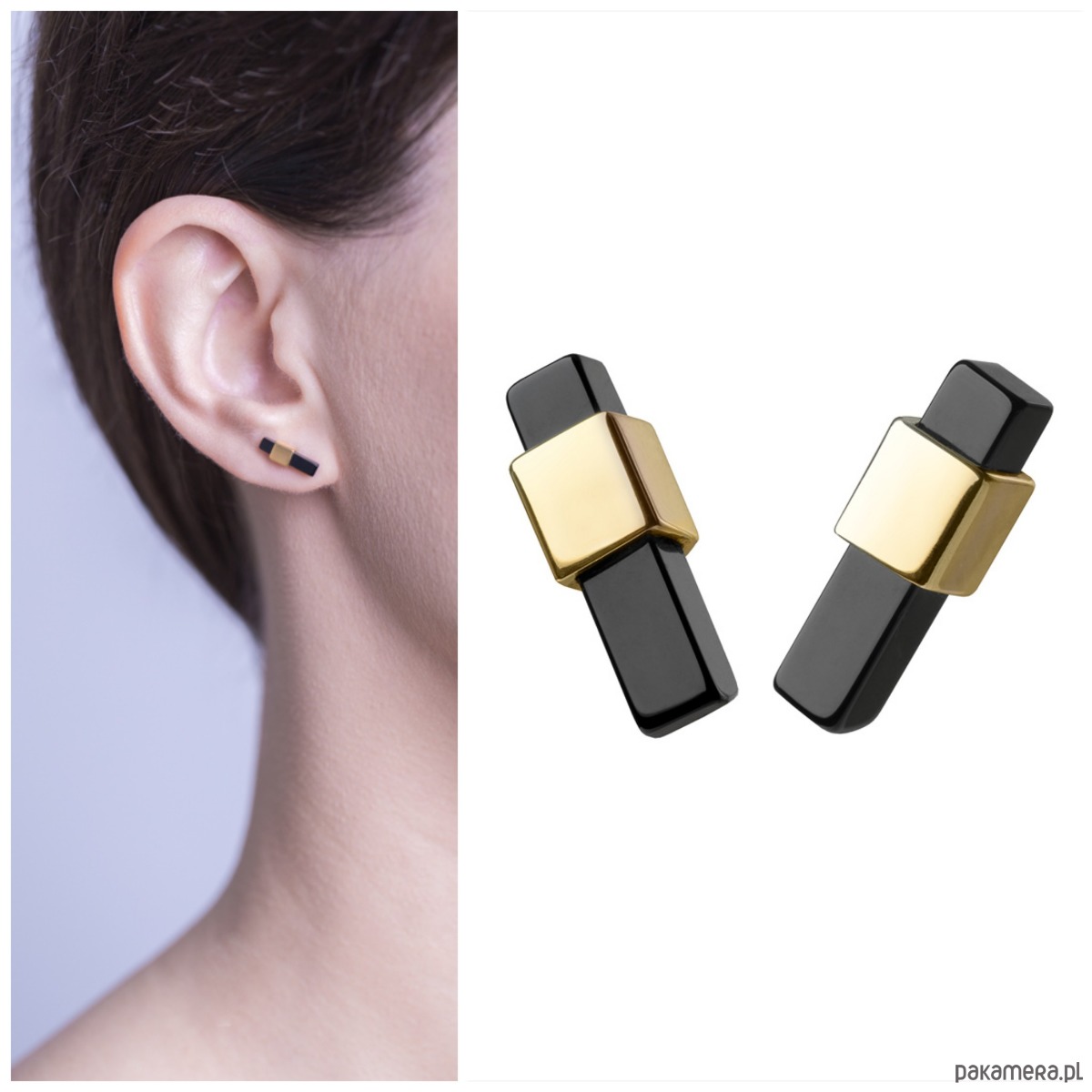Malutkie, niespełna jedno centymetrowe kolczyki na sztyft. Ciekawe połączenie czerni i złota. Doskonale prezentują się zarówno w pionie jak i w poziomie. Pozłocone 1 mikronem złota, czyli grubością, która sprawia, iż warstwa jest odporna na ścieranie przez długi czas. Wykonane ręcznie według tradycyjnych technik jubilerskich w małym warszawskim studio.