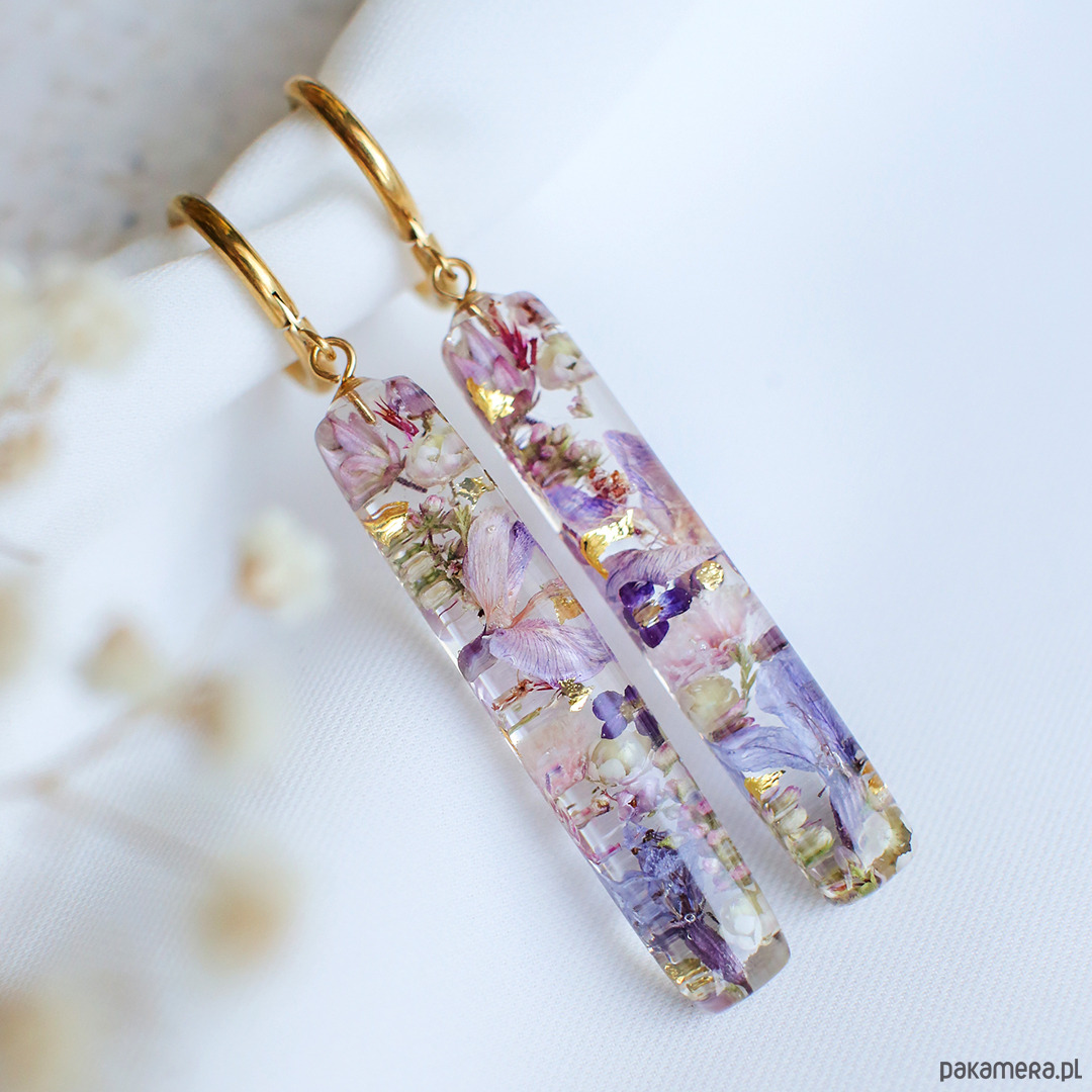 Kolczyki wykonany jest z żywicy epoksydowej z wykorzystaniem suszonych kwiatów. Metalowe elementy to stal nierdzewna szlachetna chirurgiczna.
