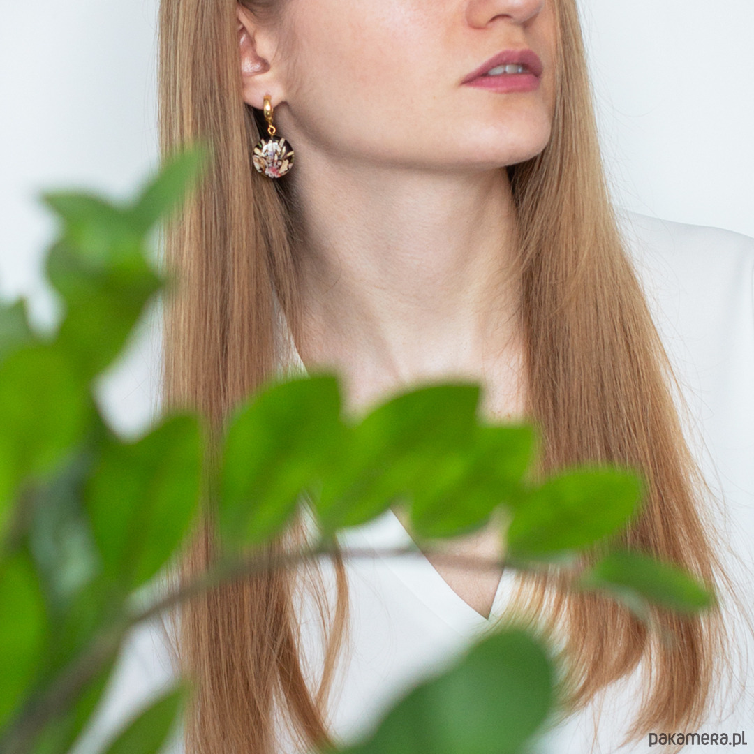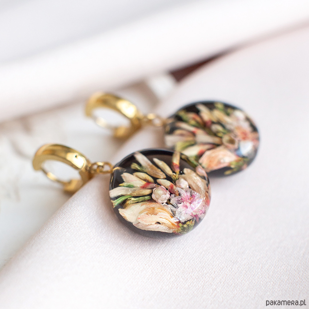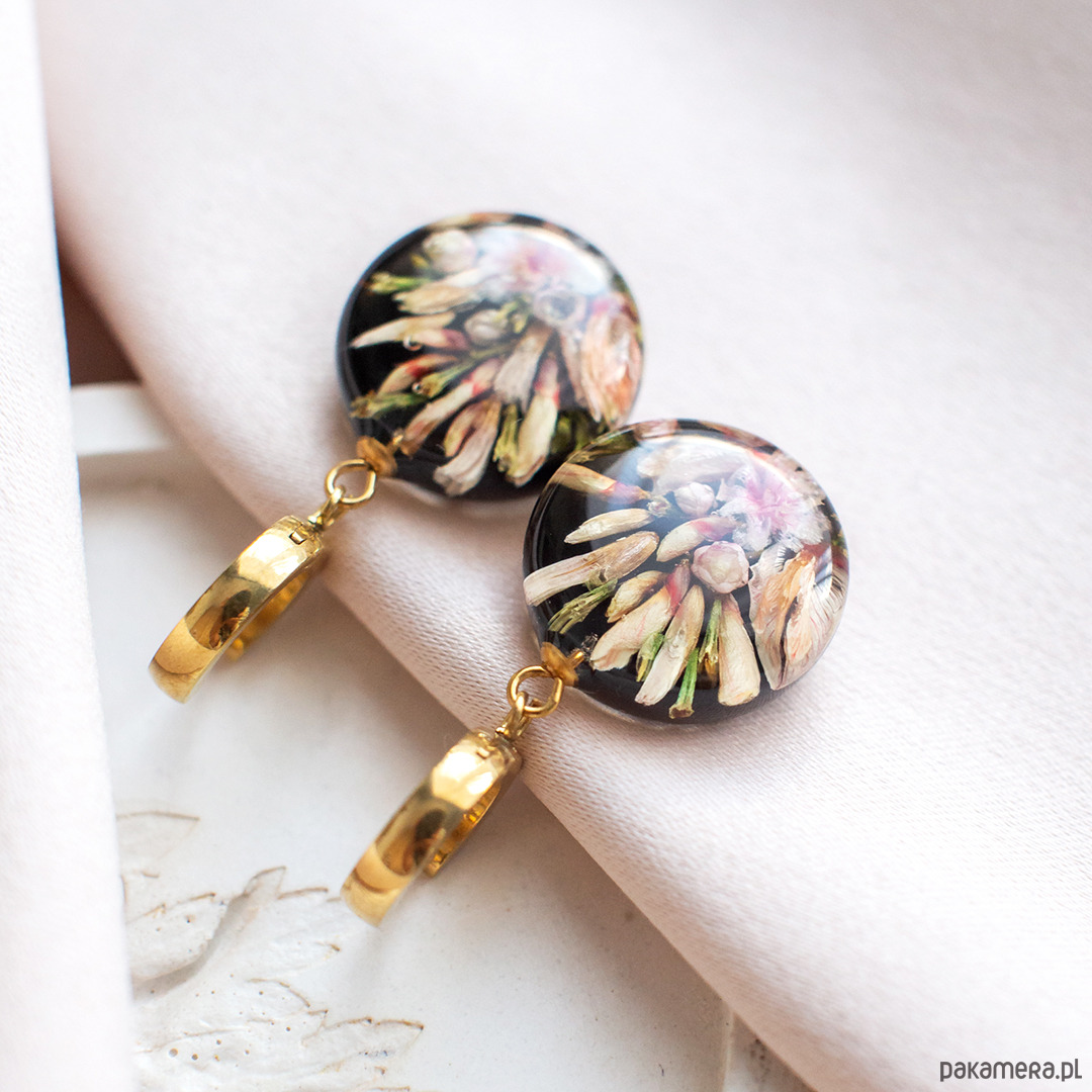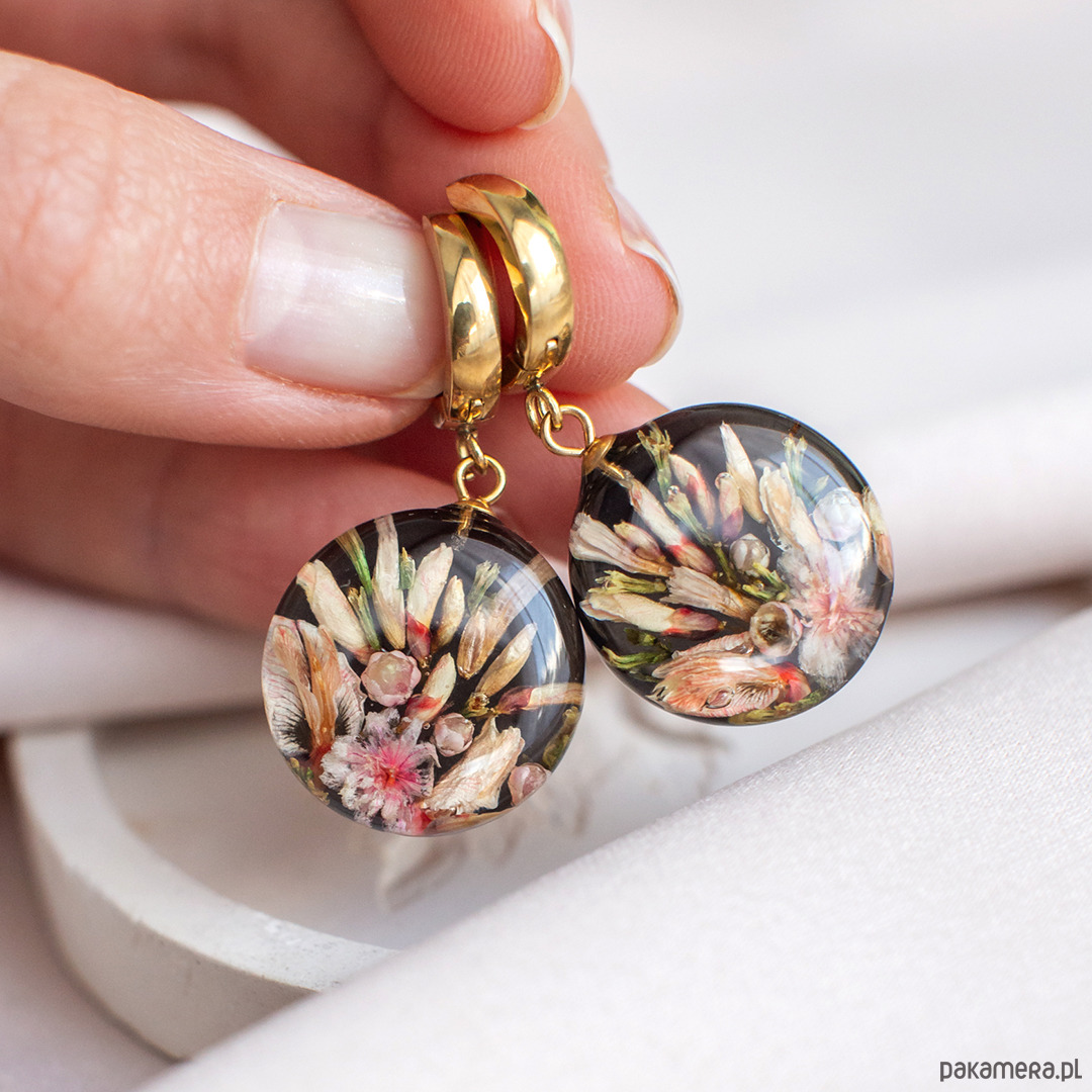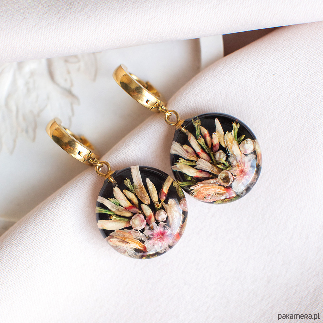 Kolczyki wykonany jest z żywicy epoksydowej z wykorzystaniem suszonych kwiatów. Metalowe elementy to stal nierdzewna szlachetna chirurgiczna.