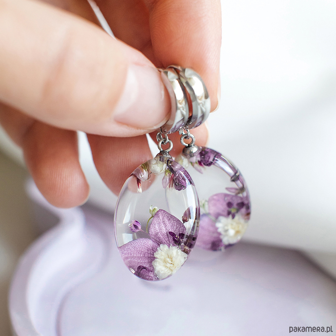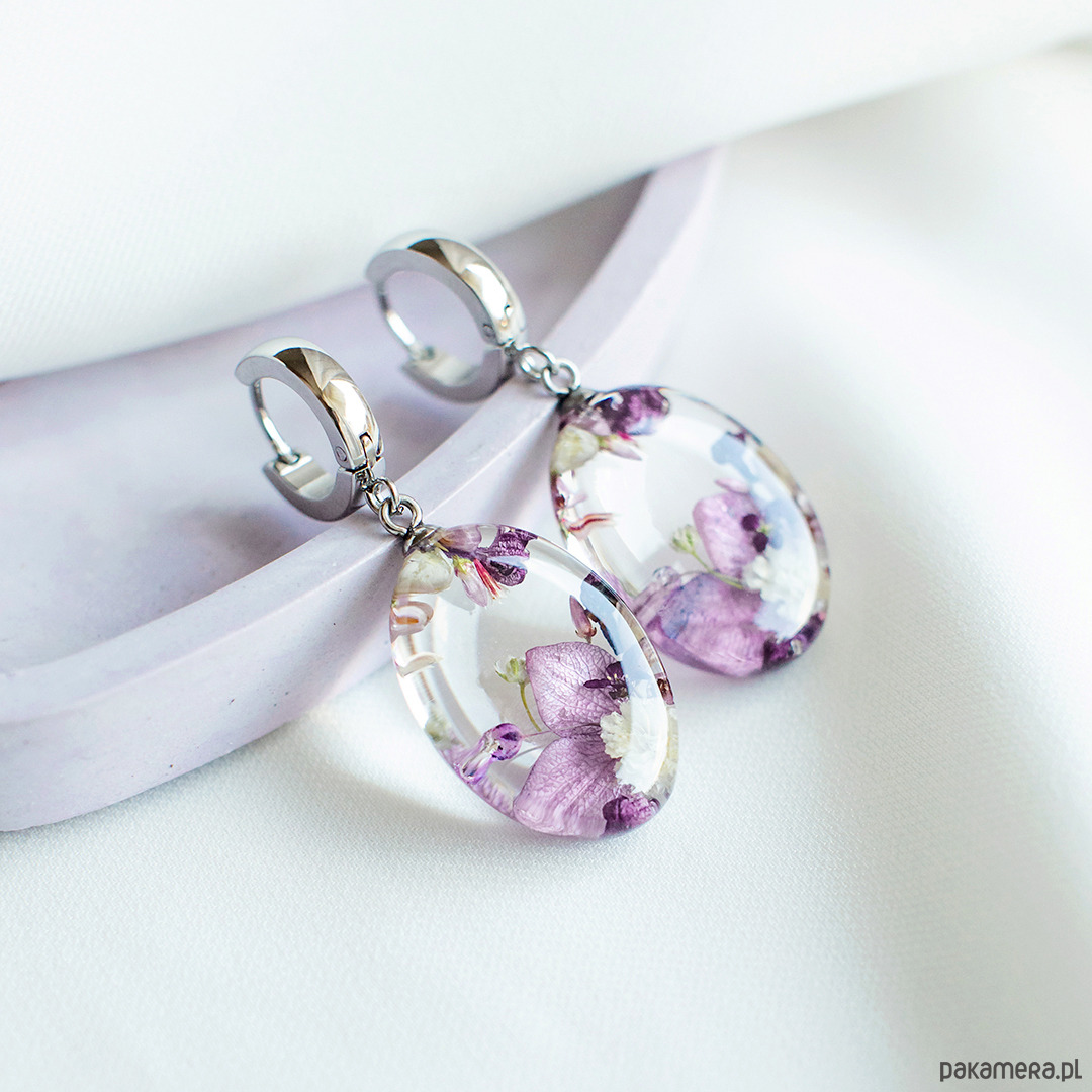 Kolczyki wykonany jest z żywicy epoksydowej z wykorzystaniem suszonych kwiatów. Metalowe elementy to stal nierdzewna szlachetna chirurgiczna.