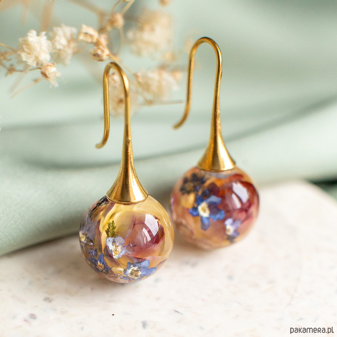 Kolczyki wykonany jest z żywicy epoksydowej z wykorzystaniem suszonych kwiatów. Metalowe elementy to stal nierdzewna szlachetna chirurgiczna.