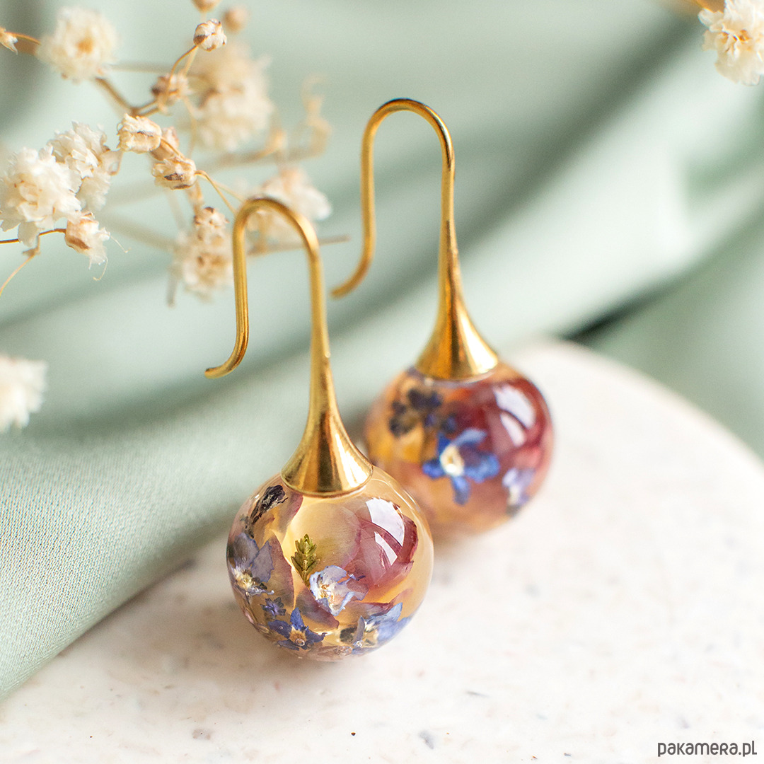Kolczyki wykonany jest z żywicy epoksydowej z wykorzystaniem suszonych kwiatów. Metalowe elementy to stal nierdzewna szlachetna chirurgiczna.