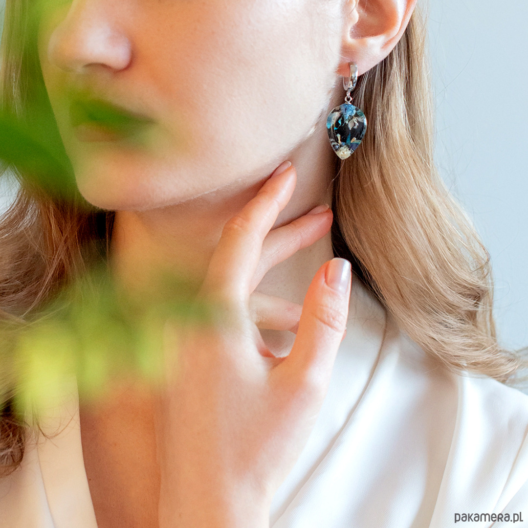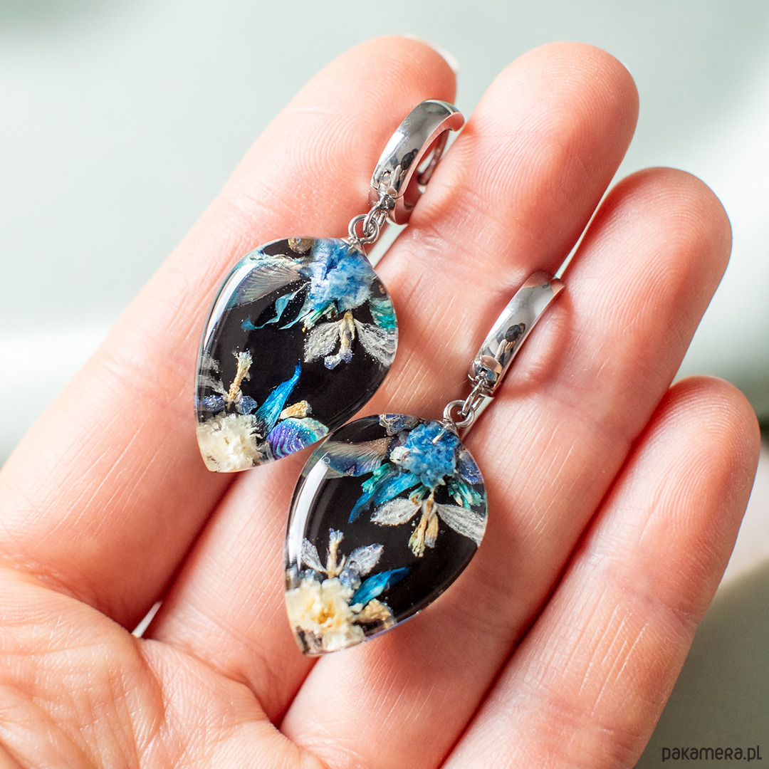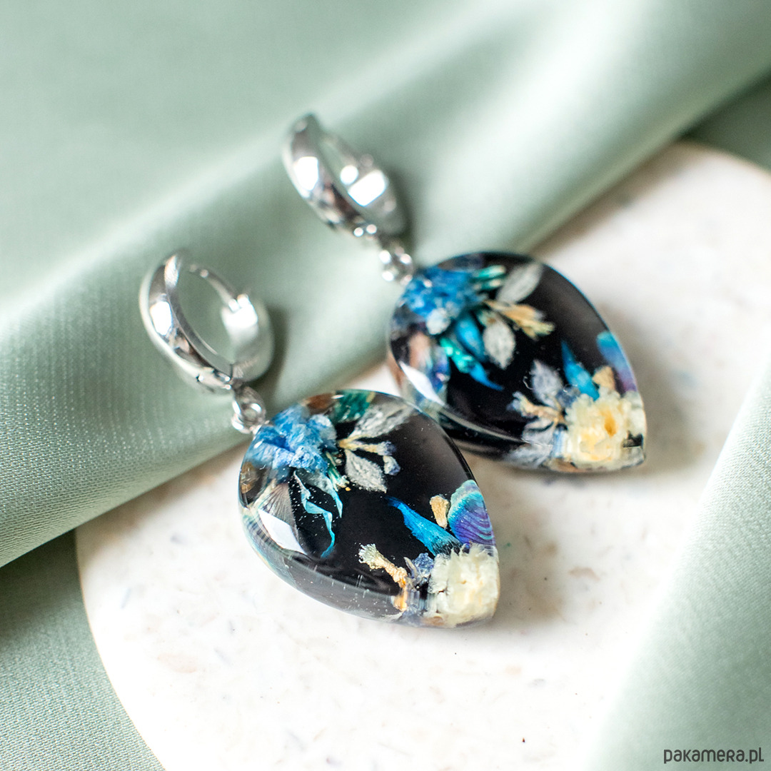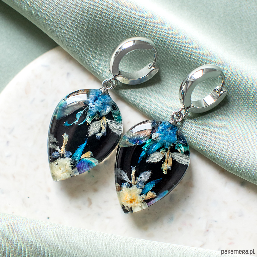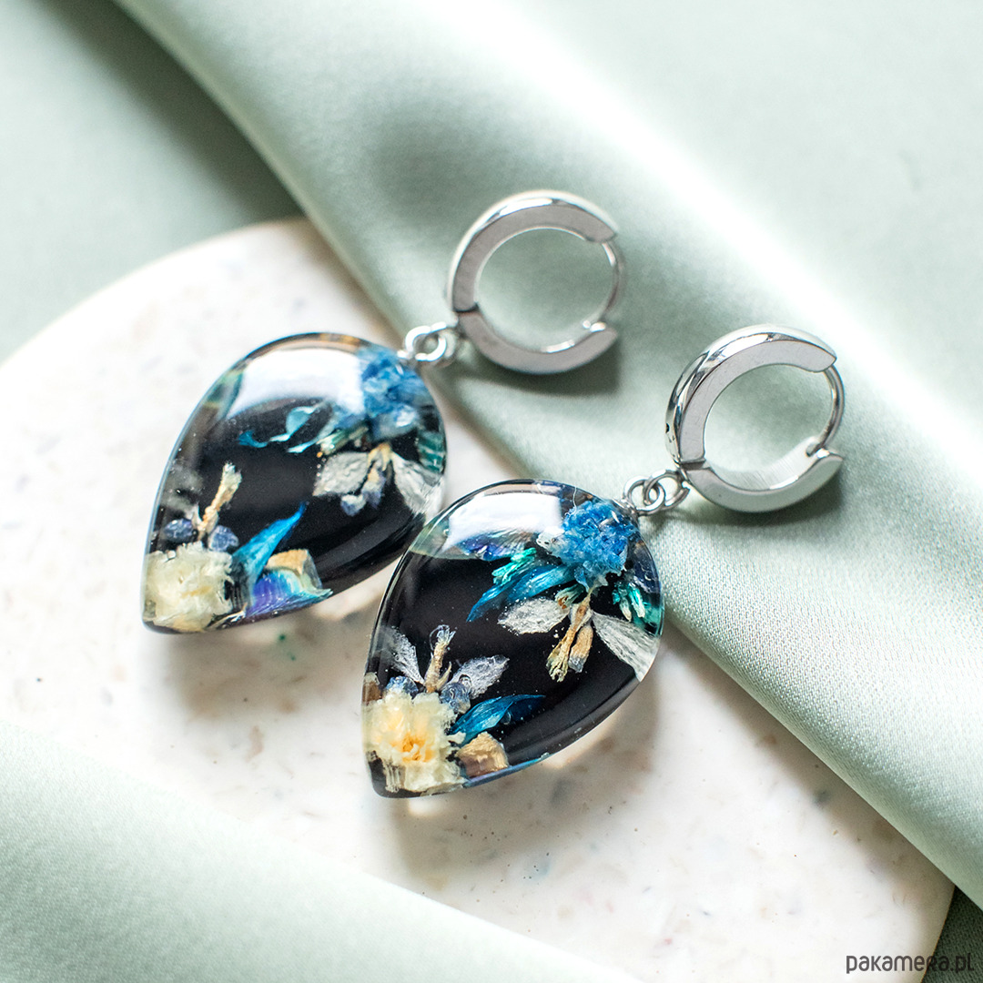 Kolczyki wykonany jest z żywicy epoksydowej z wykorzystaniem suszonych kwiatów. Metalowe elementy to stal nierdzewna szlachetna chirurgiczna.