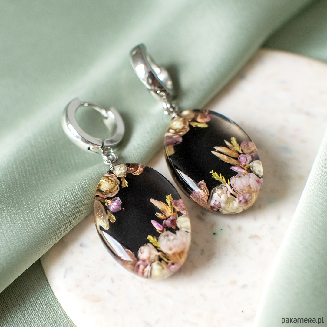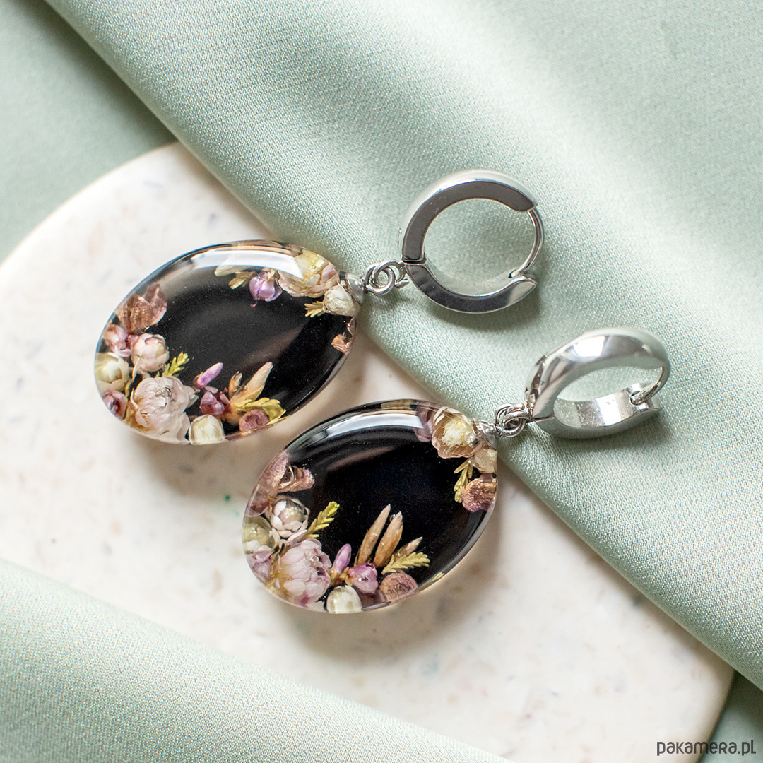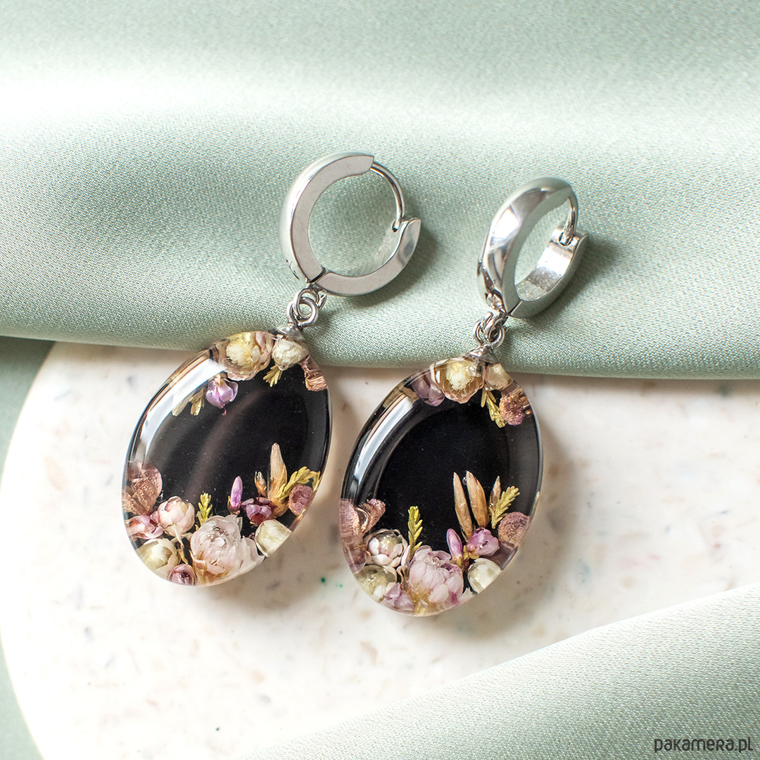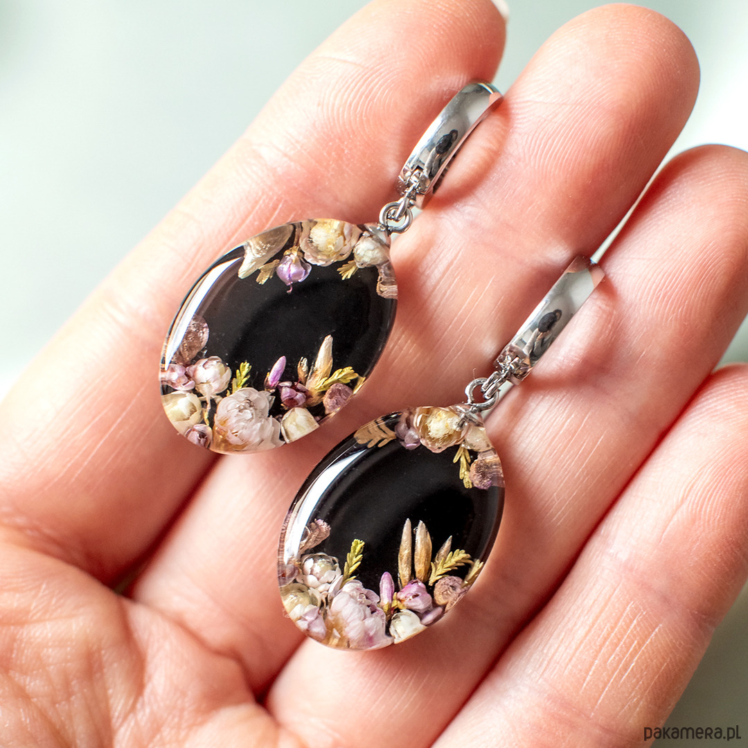 Kolczyki wykonany jest z żywicy epoksydowej z wykorzystaniem suszonych kwiatów. Metalowe elementy to stal nierdzewna szlachetna chirurgiczna.